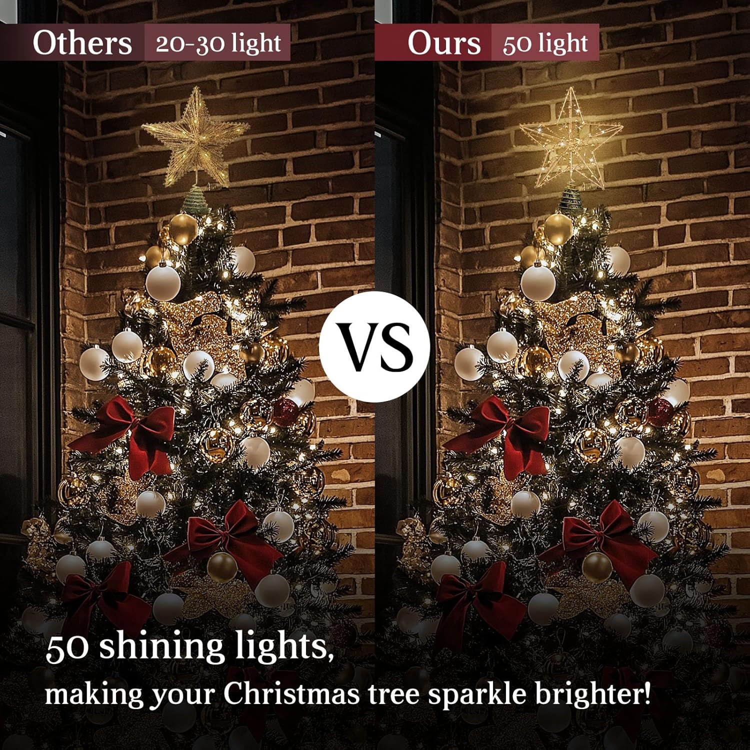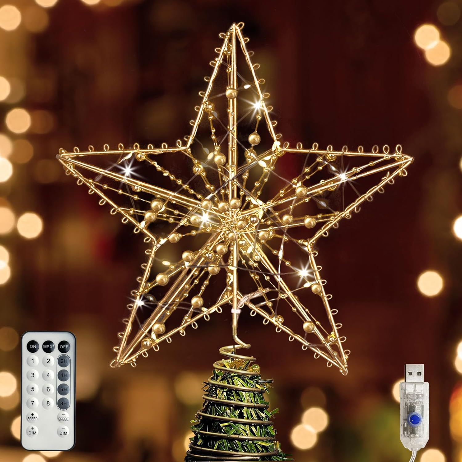- π GOLD PEARL BEADS STAR TREE TOPPER: Designed in the shape of a star, wrapped in a string of warm LED lights that glisten in the charming warm light, this hollow star decoration adds sparkling elegance to your Christmas tree. The surface of our Christmas tree decoration has many shiny sequins and powders that sparkle in the light to add an elegant and fantastical atmosphere to any Christmas decorating theme