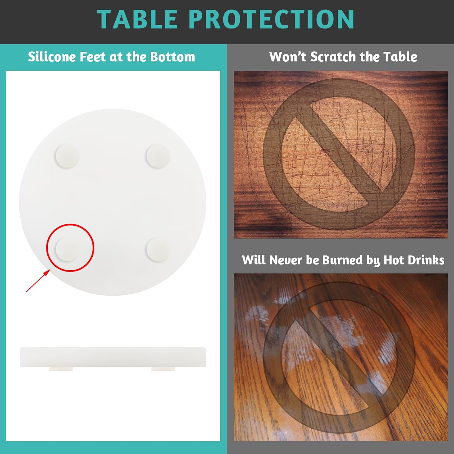 - [ Ultimate Table Protection ] : Each coaster is equipped with 4 silicone feet on the underside, protecting your surfaces from scratches. The coasters’ thickness and heat-resistant properties, combined with the silicone feet, prevent heat damage and unsightly marks from hot beverages.