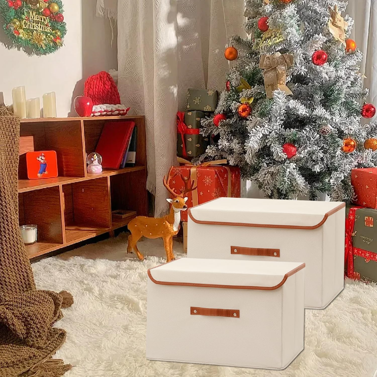 Tuza 2-Pack Large Fabric Storage Bins with Lids, Foldable Storage Boxes with Lids for Organizing, Decorative Storage Boxes with Handles for Home, Bedroom, Closet, Office(Khaki, Large)