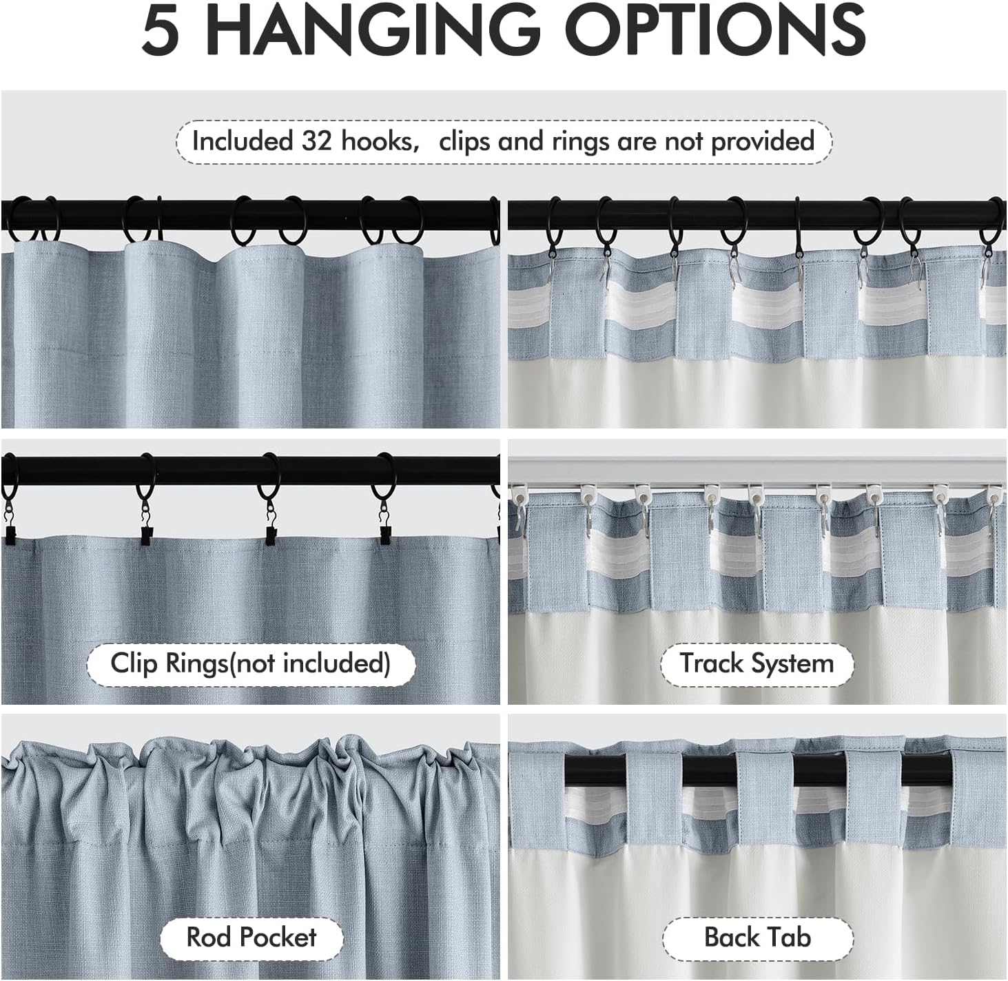 - VERSATILE HANGING OPTIONS: Choose from four hanging styles: back tabs, rod pockets, small hooks on the hook belt, or ring clips (ring clips not included). Quick and easy to install, tailored for your convenience.