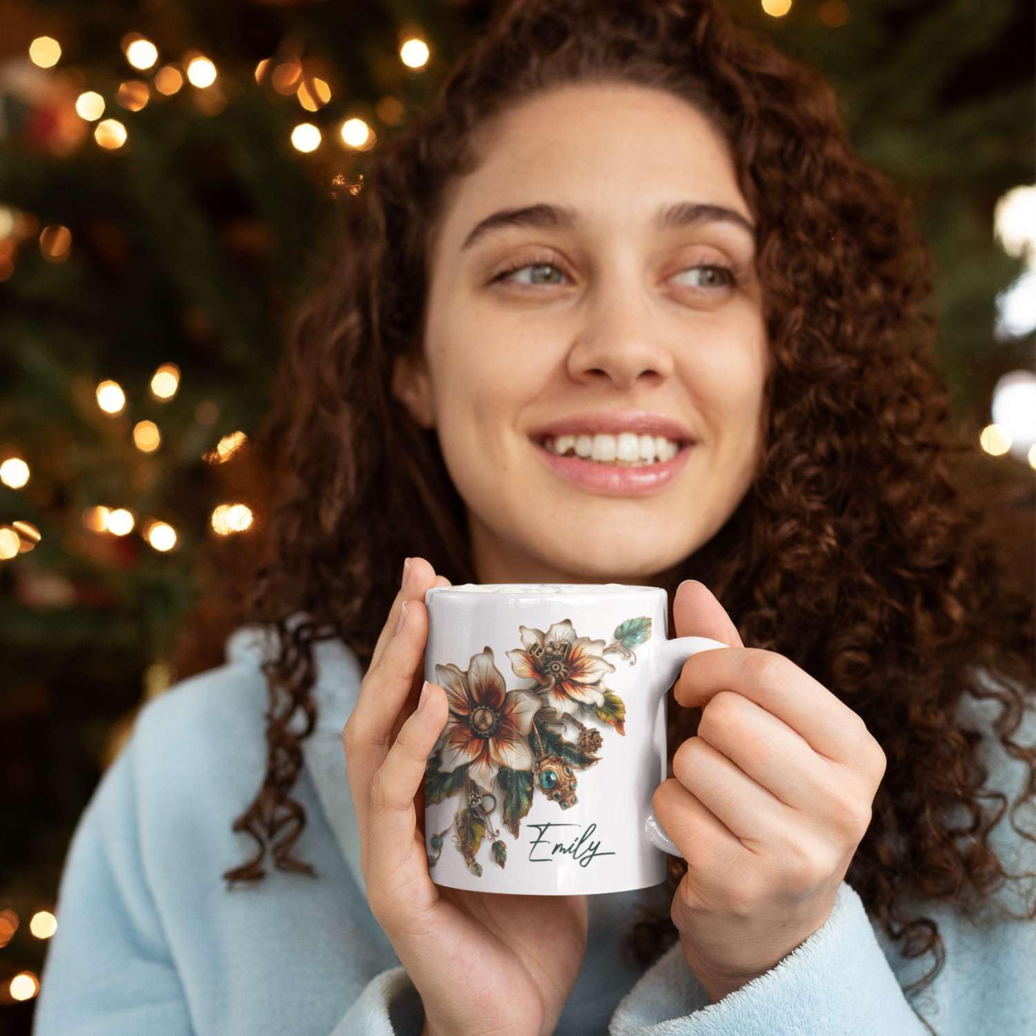 Customized Name Coffee Cup, Custom Steampunk Floral Design Cup, Personalized Flower Lover Ceramic Cup 11oz, White Mug Gift For Floral Enthusiasts, Steampunk Flower Cup For Birthday