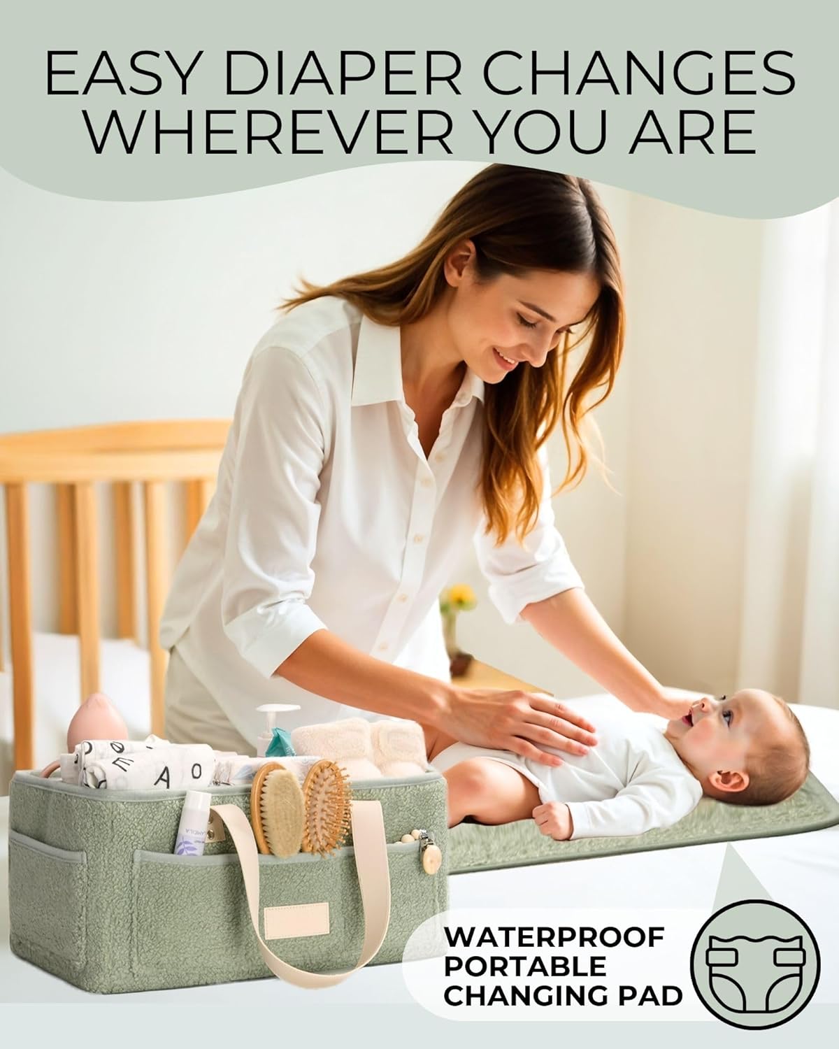 Baby Diaper Caddy Organizer with Portable Changing Mat - Teddy Fleece Diaper Organizer for Changing Table - Basket for Changing Essentials - Baby Essentials Organizer with Removable Dividers