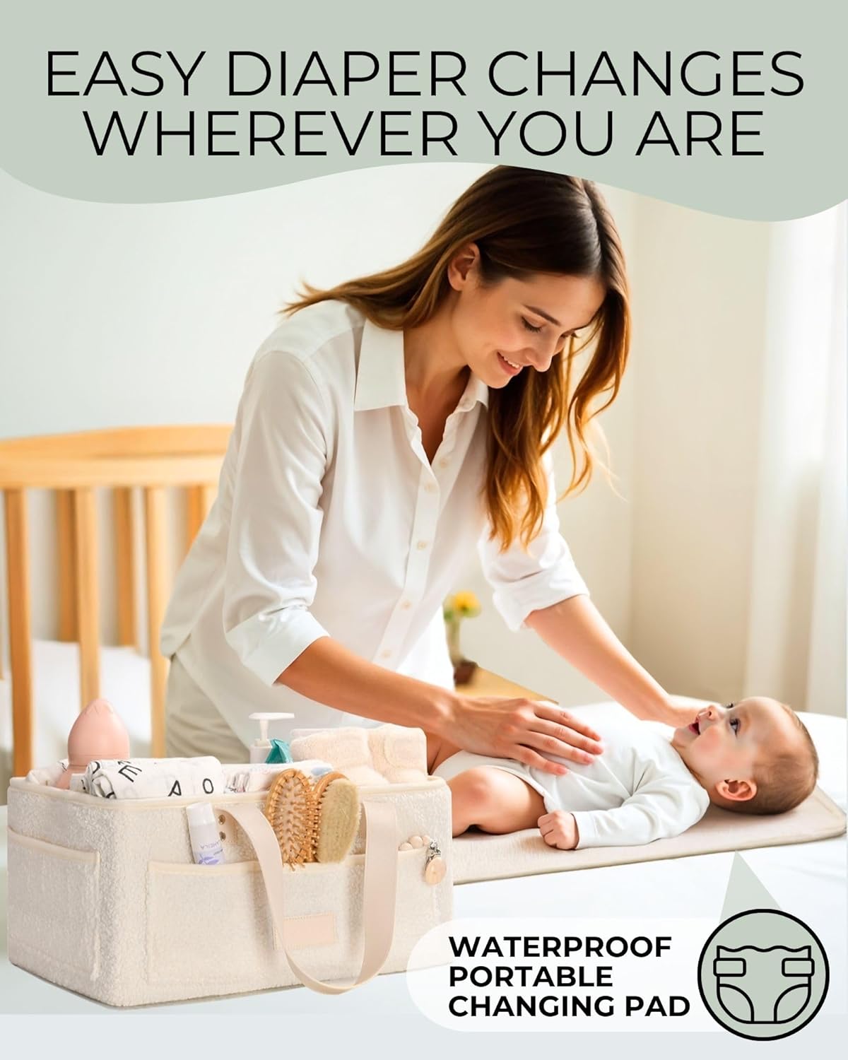 Baby Diaper Caddy Organizer with Portable Changing Mat - Teddy Fleece Diaper Organizer for Changing Table - Basket for Changing Essentials - Baby Essentials Organizer with Removable Dividers