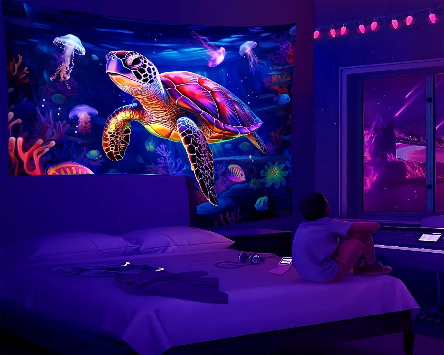 - UV REACTIVE / BLACK LIGHT: Uv sea turtle tapestry is printed with the latest heat transfer technology and UV reactive inks to produce a neon effect under black light. The actual visual effect depends on the power of the light you use, our pictures are taken under 40w 368nm UV light
