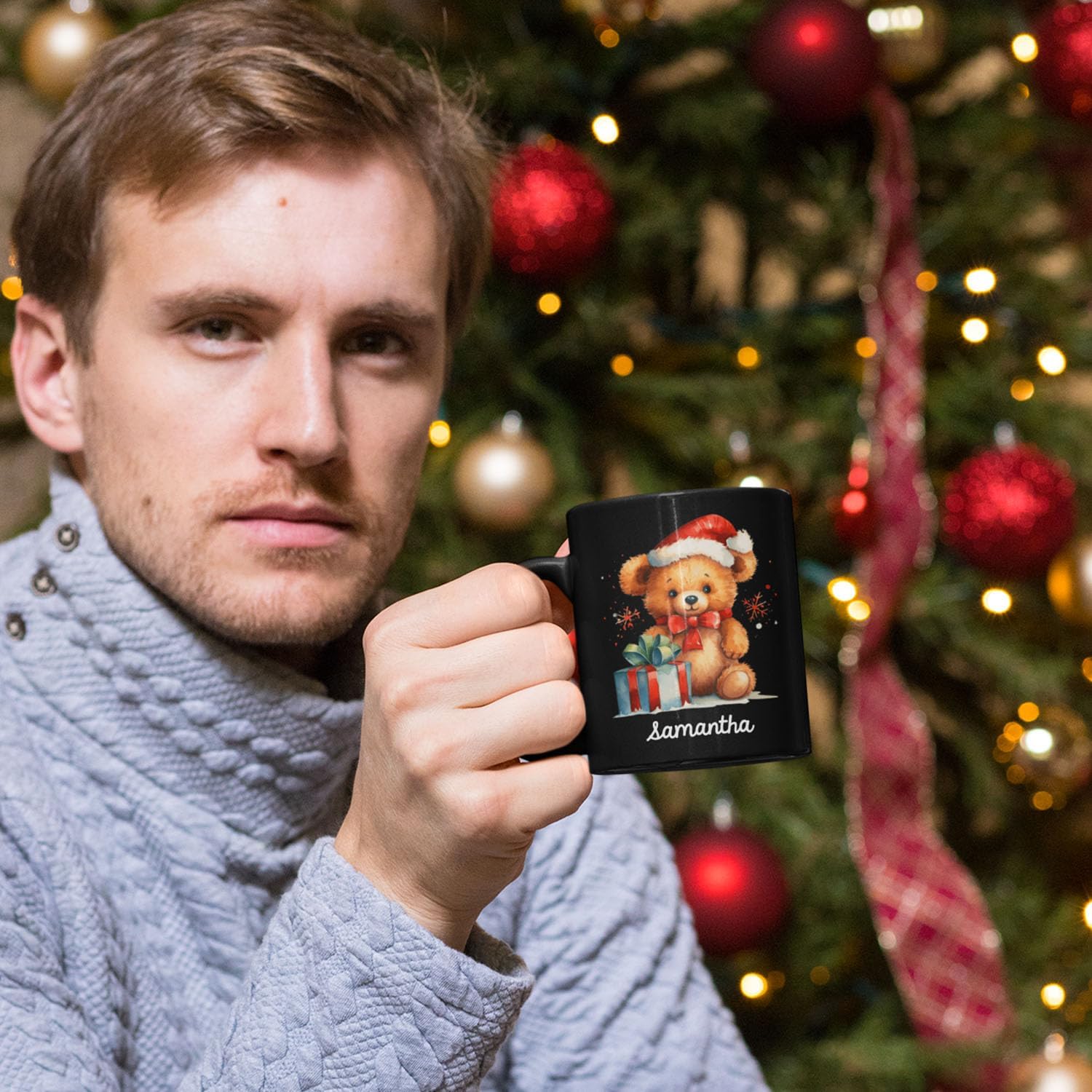 - π UNIQUE DESIGN MUG: Spread holiday cheer with this "Custom Name Xmas Teddy Bear Cup" featuring a cute teddy bear in a Santa hat beside a festive gift. Click "Customize Now" to add a name, making it a personalized gift for the holiday season. This black ceramic mug is ideal for enjoying warm winter drinks in a cozy setting.