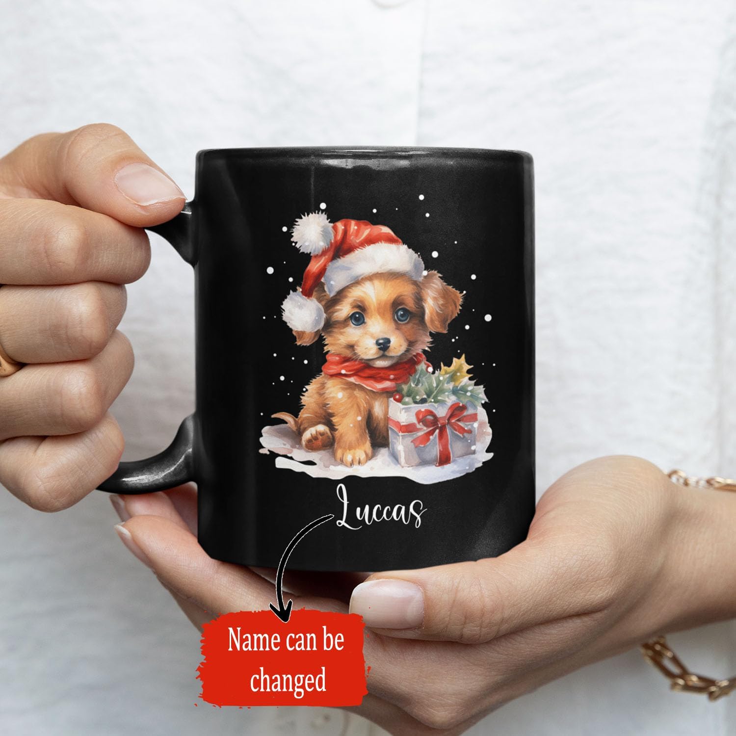 - π UNIQUE DESIGN MUG: Bring holiday joy to any pet lover with this "Personalized Name Xmas Puppy Cup" featuring a cute puppy in a Santa hat design. Click "Customize Now" to add a name, making it a great personalized gift for the holiday season. This black ceramic mug is ideal for sipping warm drinks in cozy winter settings.