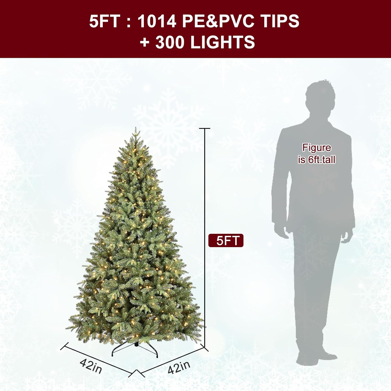 5FT Pre-Lit Artificial Christmas Tree with 1032 PE&PVC Mixed Branch Tips, 300 Warm White Lights, Hinged Premium Spruce Fake Xmas Trees, Green, Foldable Base