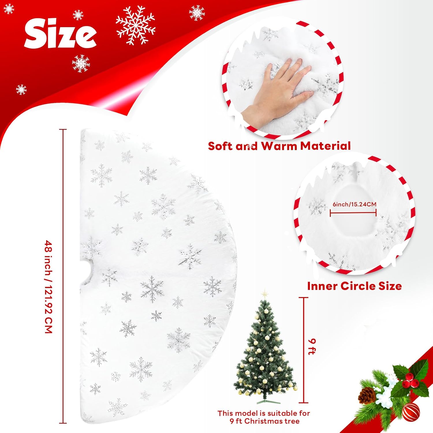 Christmas Tree Skirt 48 Inch, Holiday Part Decorations for Christmas Tree, Whit Plush Sliver Sequin Snowflake Tree Shirt for Xmas