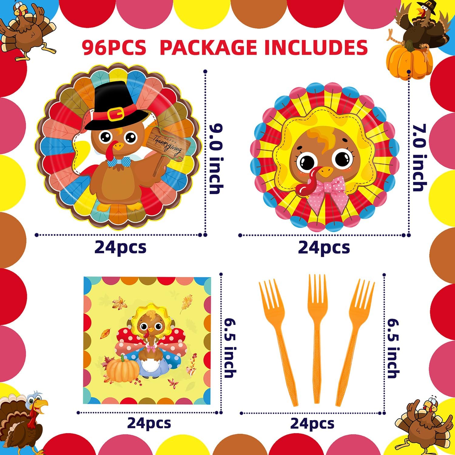 - Thanksgiving Party Decoration Set: You will receive totally 96 piece turkey theme party supplies, including 24 Thanksgiving plate 9inch,24 pieces turkey plate 7inch,24 pieces Thanksgiving napkin and 24pcs forks,The Thanksgiving party favors are enough to decorate your party