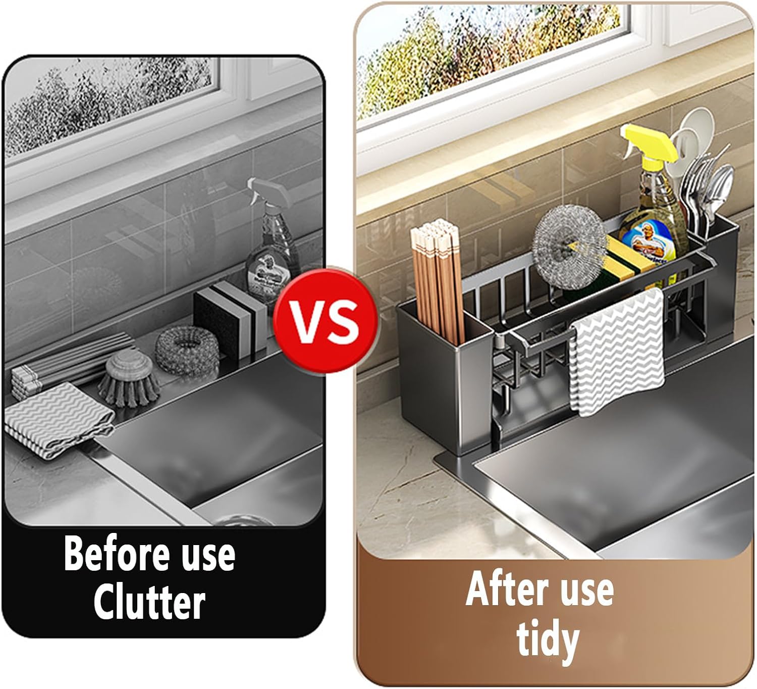 - Perfect Self-Draining Tray Design:This kitchen sink caddy features a self draining tray design that quickly drains water into the sink, helping your cleaning tools dry faster and stay clean.