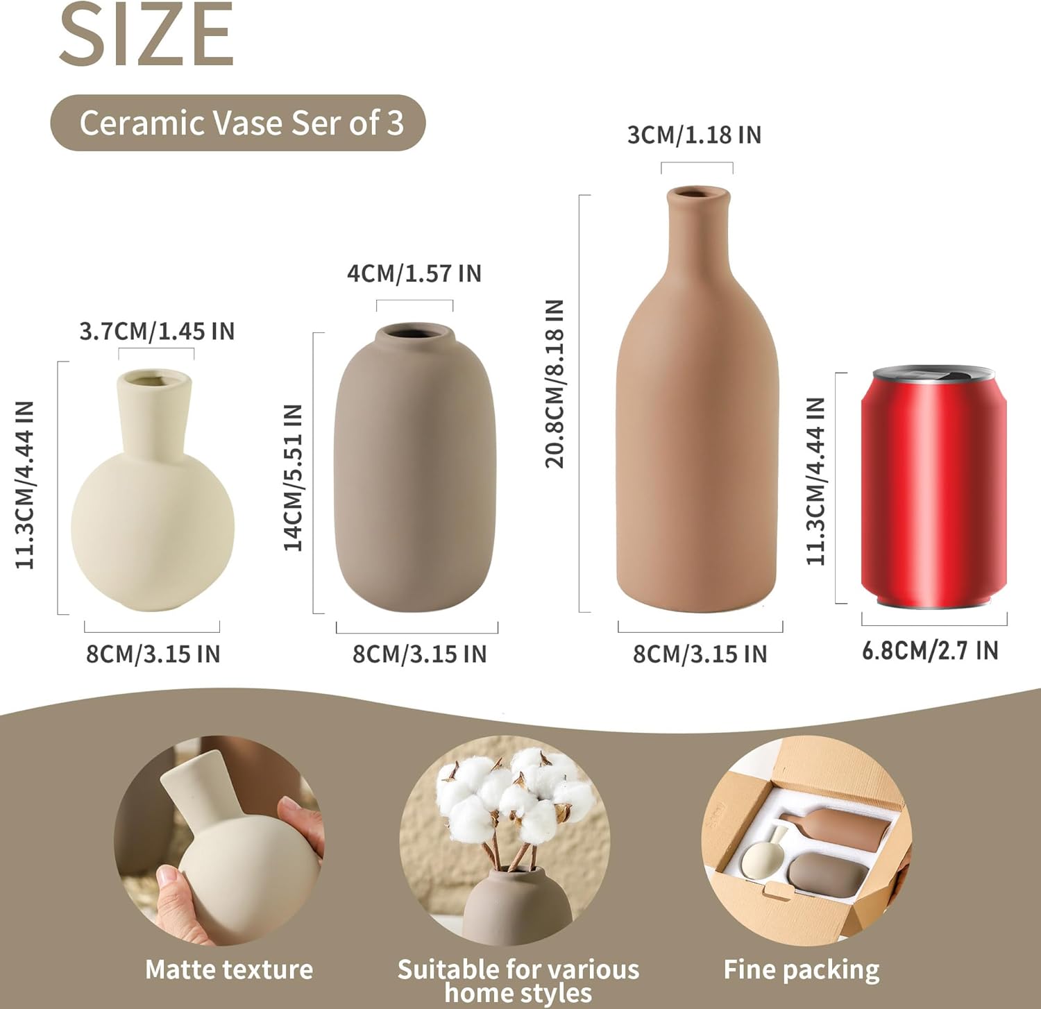 - 【Home Décor Ceramic Vases】More than vases, they are wonderful home decor. This set of ceramic vases is perfect for artificial flowers or fresh flowers and plants, can be placed individually or in combination, as a neutral home decor, living room decoration, bedroom decor,tabletop decoration, bookshelf decoration, storage rack decoration, mantelpiece decoration, entryway decor,dining room decor, minimalist side table decor,etc.