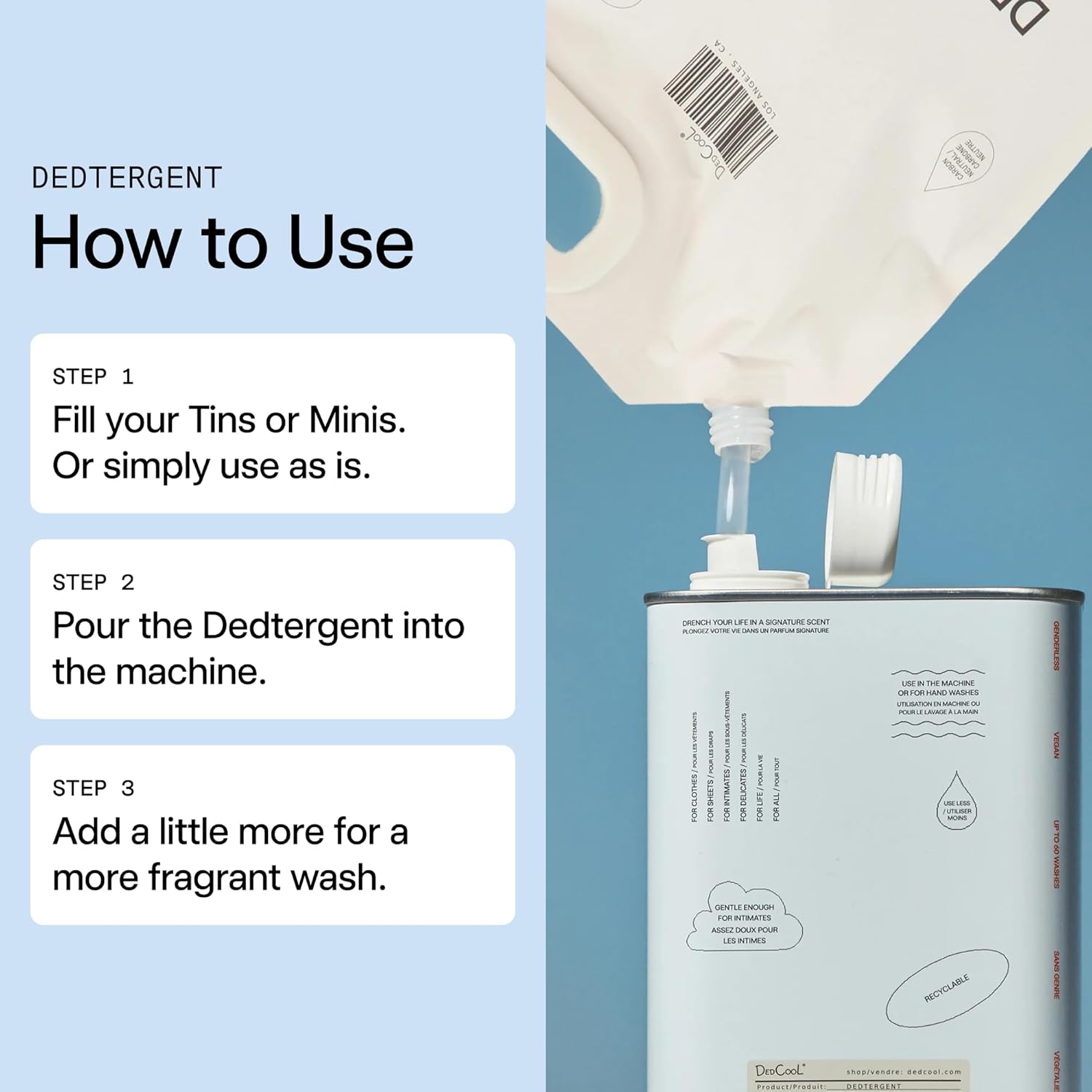 - Versatile & Efficient: Whether used in a washing machine or for hand washing, this essential oil laundry detergent is versatile and efficient. As an all-liquid laundry detergent, it’s perfect for odor removal, offering a fresh, clean scent that lasts. Choose DedCool for the best-smelling and most effective natural laundry detergent liquid on the market.