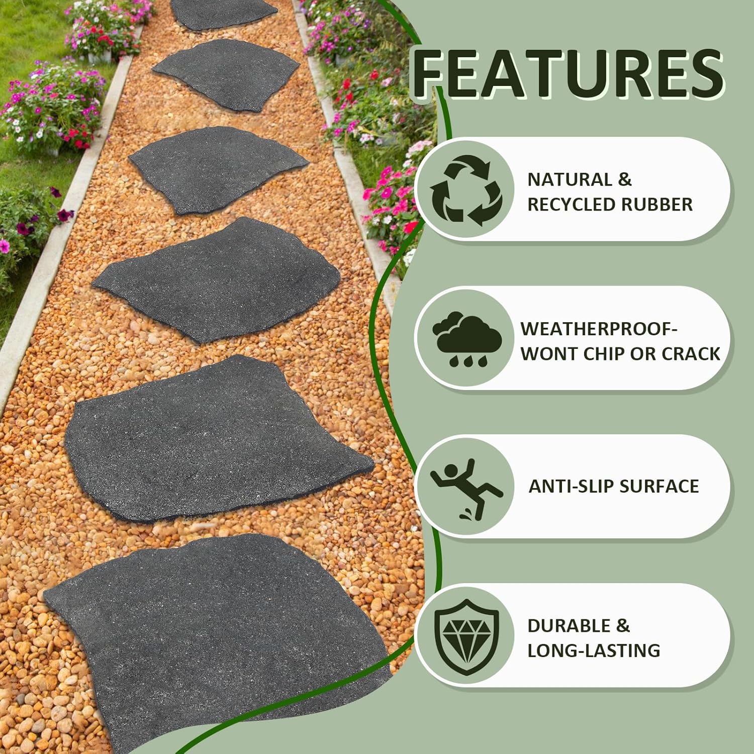 - DURABLE: Made from recycled rubber, these stepping stones outdoor are heavy enough to stay put in place and durable to withstand all weather condition.