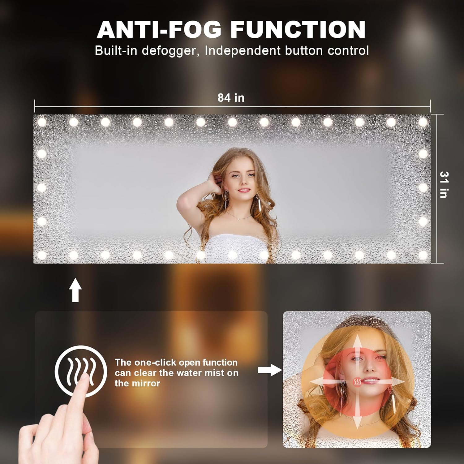 - 【Hollywood Design with Full Illumination】This modern bathroom mirror features a 84" x 31" HD glass mirror with a Hollywood-style design and 32 LED bulbs, delivering even, shadow-free lighting. Its frameless design and elegant Hollywood aesthetic bring style and functionality to any luxurious bathroom décor.