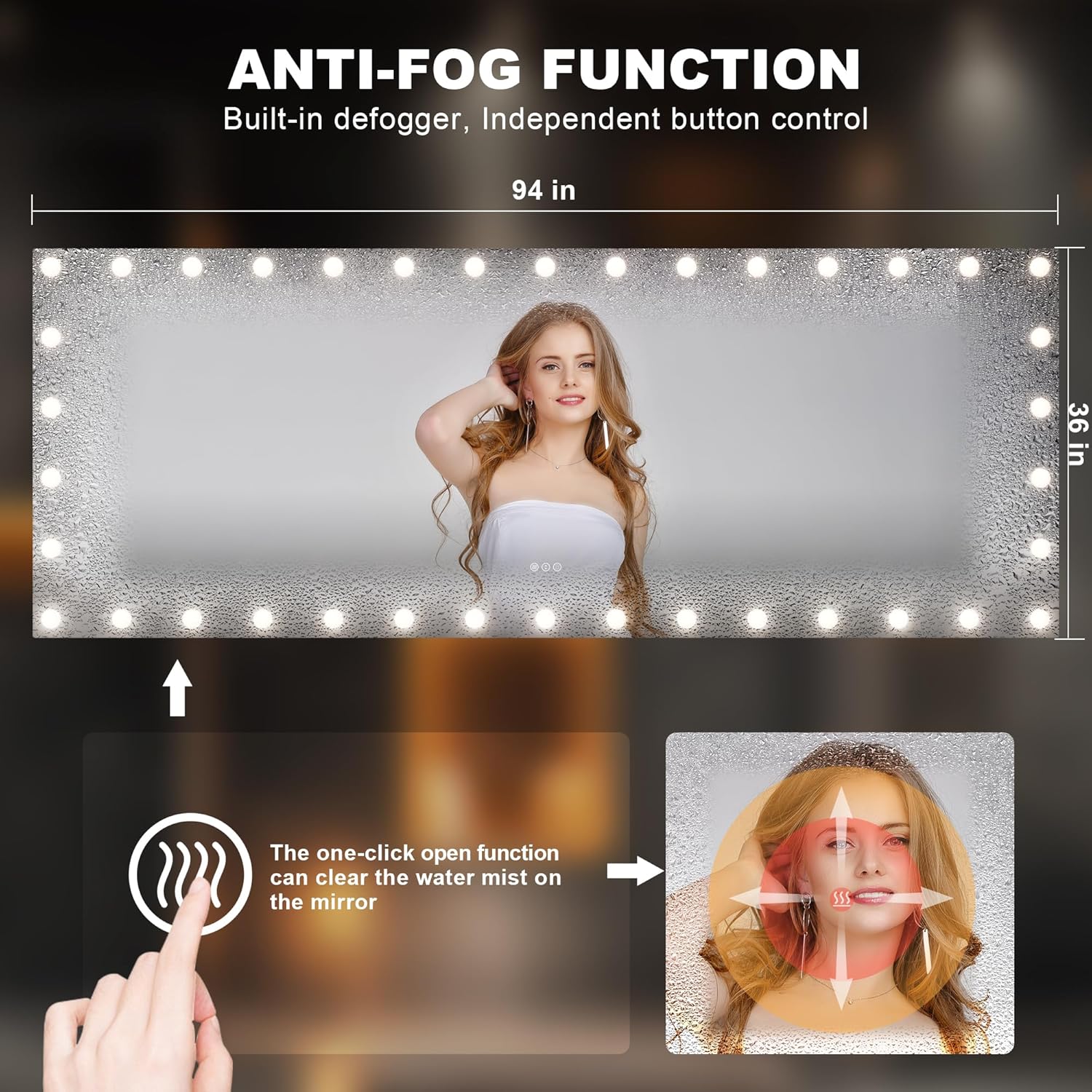Hasipu LED Bathroom Mirror with Lights, 94" x 36" Hollywood Wall-Mounted Bathroom Mirror with 38 Dimmable Bulbs, 3 Colors Modes, Touch Control, Anti-Fog, Memory Function, Shatter-Proof, ETL Listed