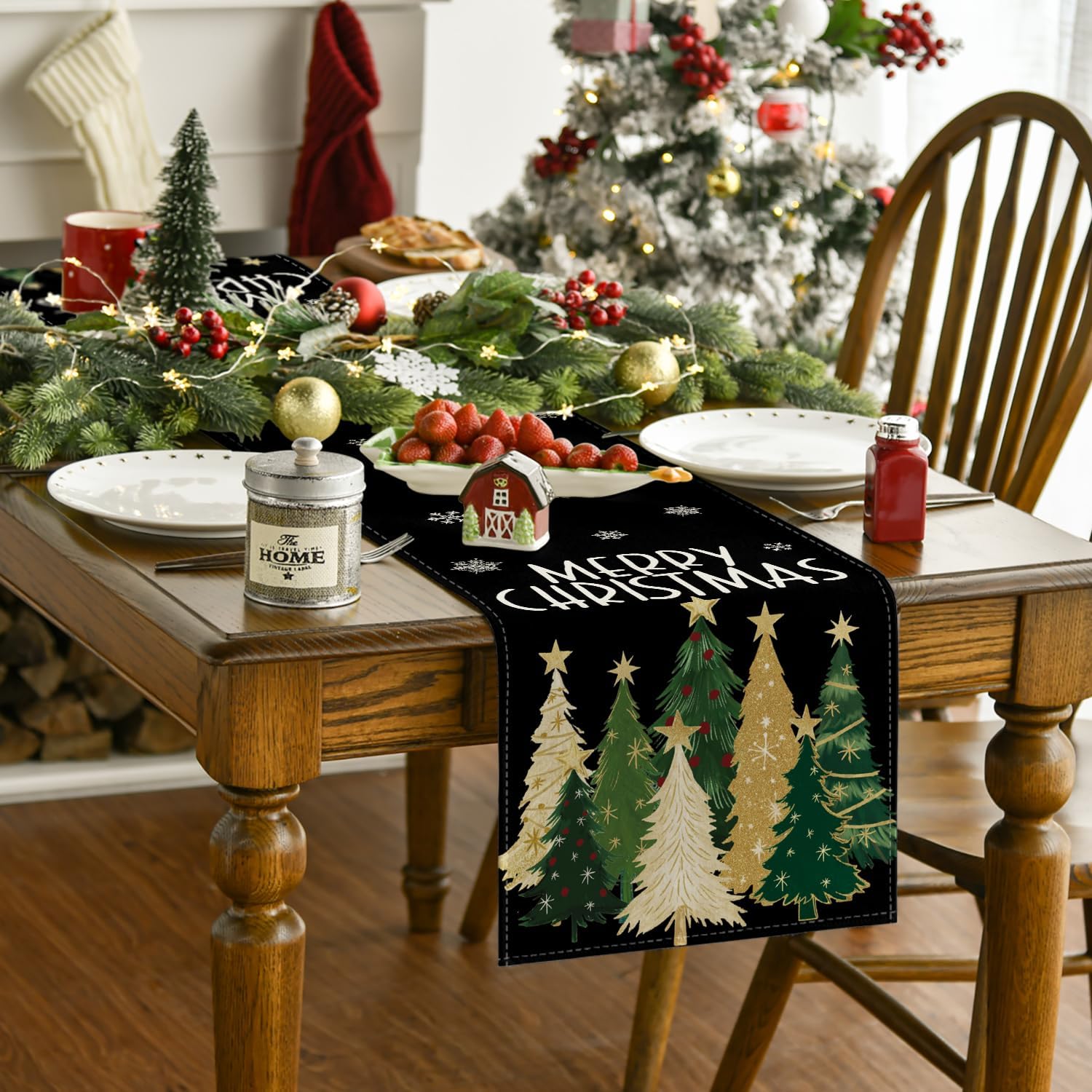 Artoid Mode Xmas Trees Snowflakes Black Merry Christmas Table Runner, Winter Seasonal Kitchen Dining Table Decoration for Home Party Decor 13x60 Inch