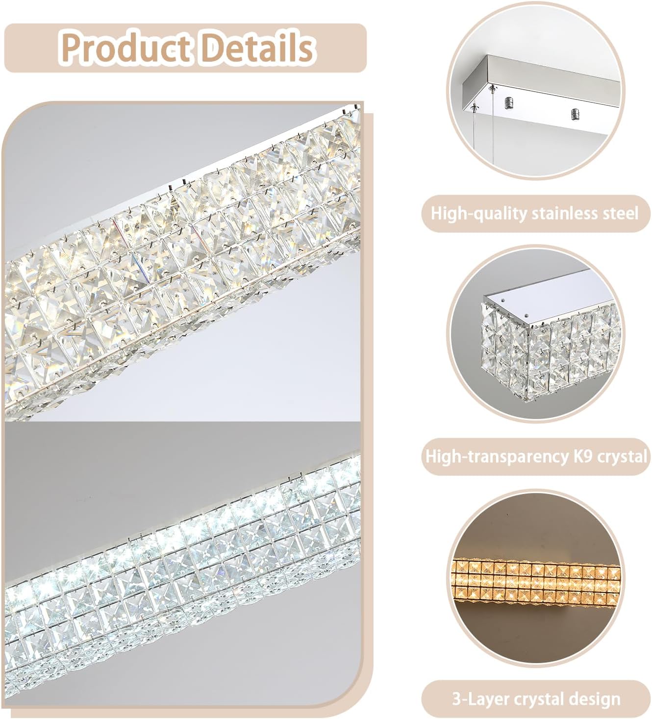 W48 Modern Rectangular Crystal Chandeliers Dining Room Chandelier,Silver Pendant Light Fixture with Remote Control for Living Room Kitchen Island