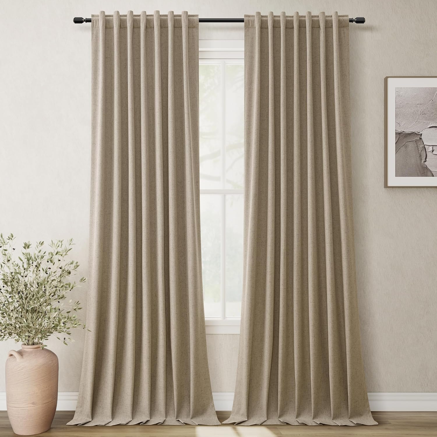 BOODII Khaki Linen 100% Blackout Curtains for Bedroom 102 Inch Long 2 Panels Window Curtain Floor to Ceiling Length for Living Room Sliding Glass Door Back Tab Linen Room Darkening Drapes 52x102