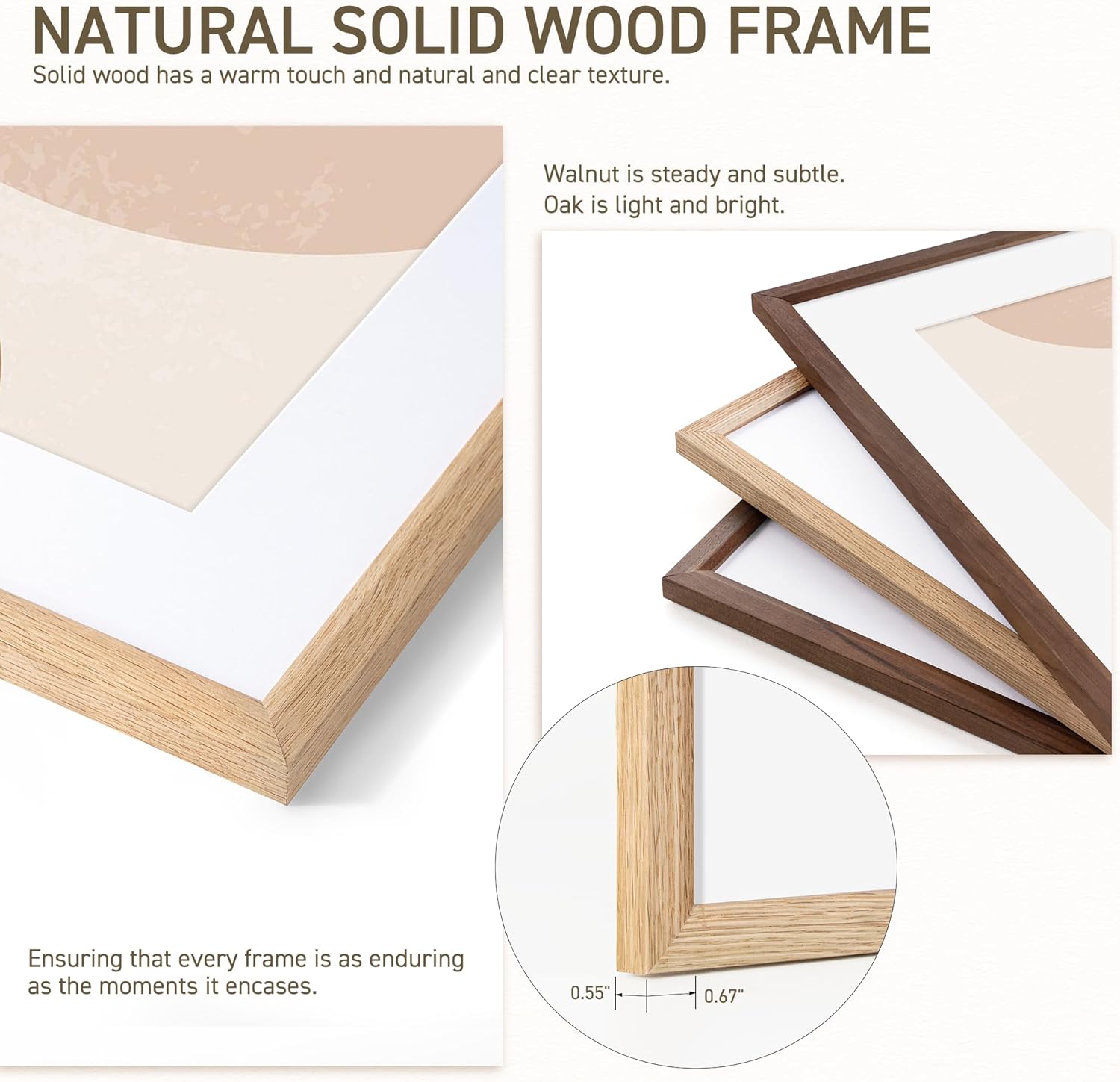 - High-Quality Solid Oak Wood Frame: The picture frame is made of 100% solid oak wood, showcasing its natural wood grains for an authentic look. This premium material ensures durability and adds a touch of elegance to any space. It's an excellent way to add color and personality to space and make memories last a lifetime.