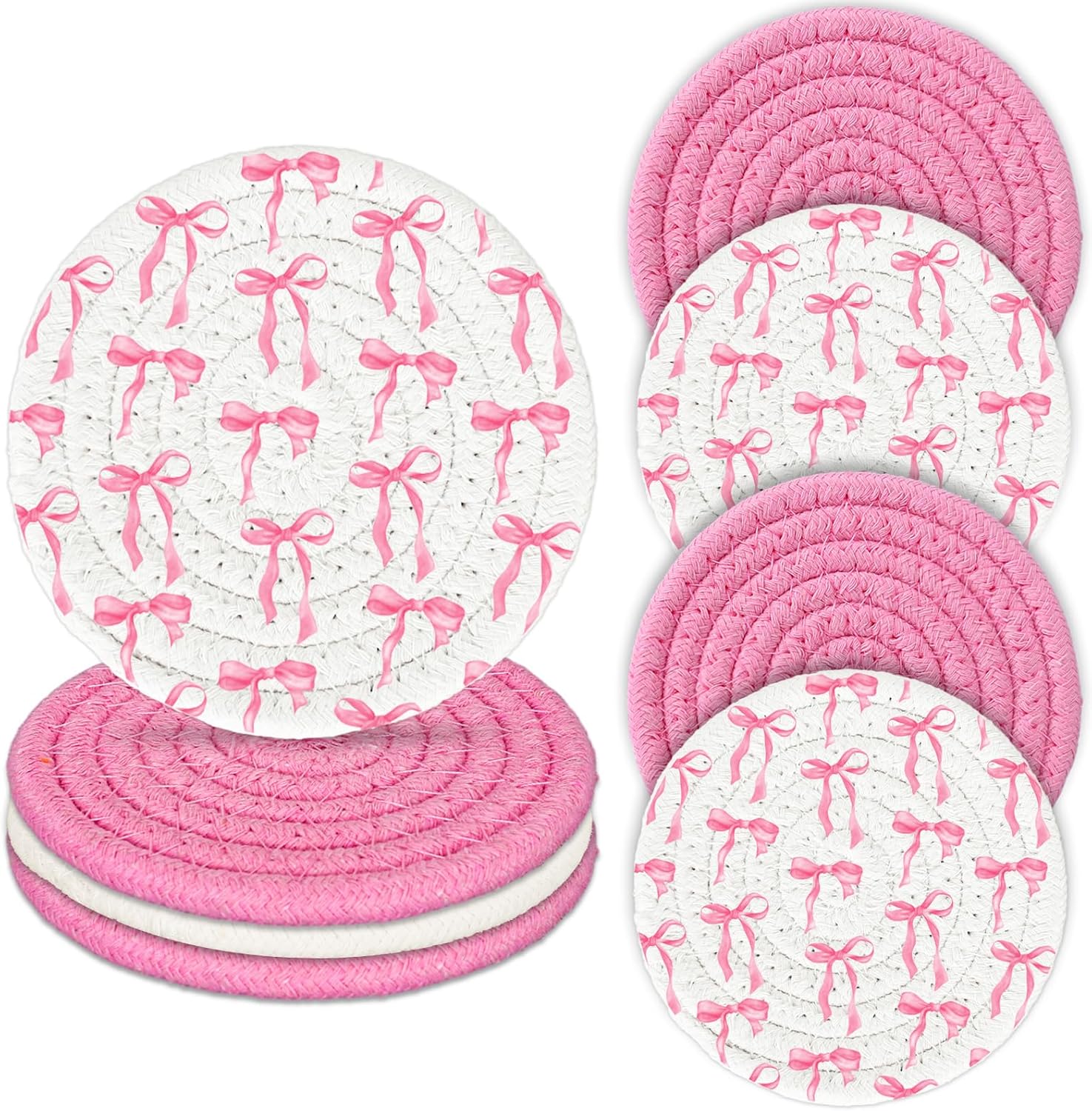 Whaline Pink Bow Coasters Handmade Braided Cotton Coasters Round Absorbent Bowknot Coquette Drink Mats for Breast Cancer Awareness Birthday Wedding Baby Shower Party Home Office Table Decor, Set of 4