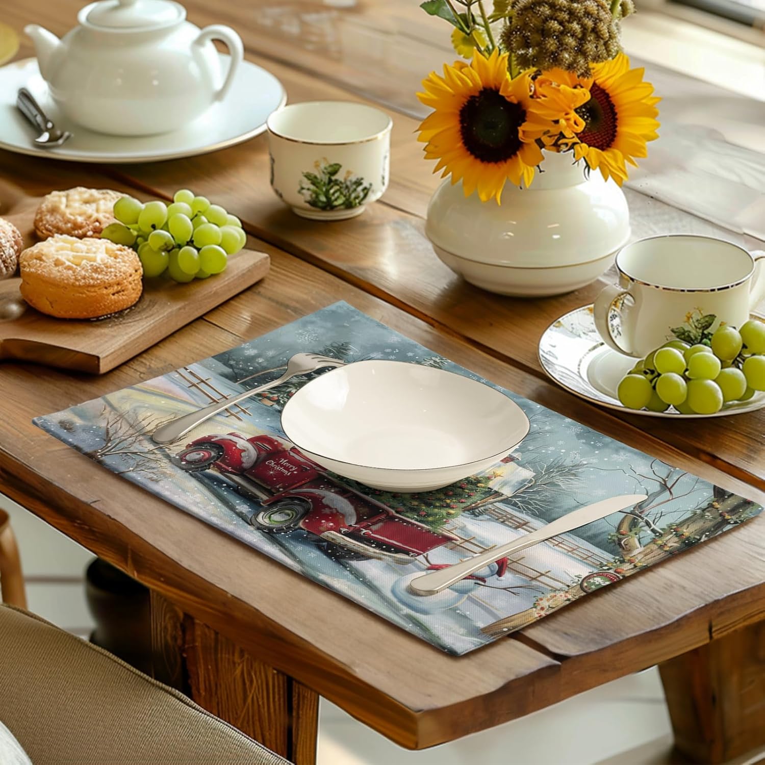 - PERFECTLY SIZE: The Christmas kitchen placemats set of 4, Each Christmas red truck place mat is 18่ณ12 inch (45cmx30cm) that can exactly fits your needs to use in all kinds of situations