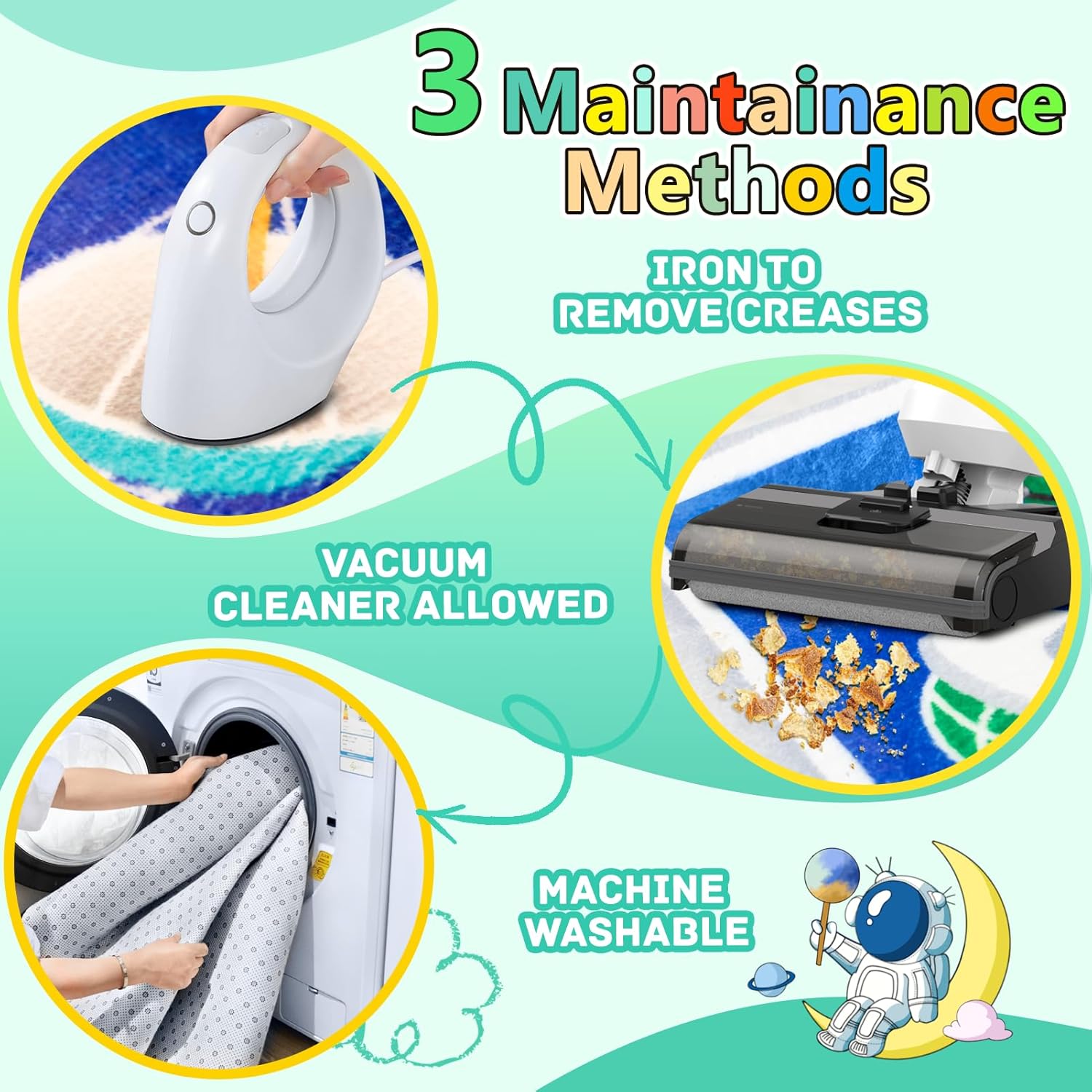 - [Unique Design]: The spaceship road rug for educational learning nursery. Unique 3D three-dimensional pattern design, colorful cartoon outer Space, Planet, Rocket. Your child could use all of their toys for hours of exploration on the Space Playmat Rugs.
