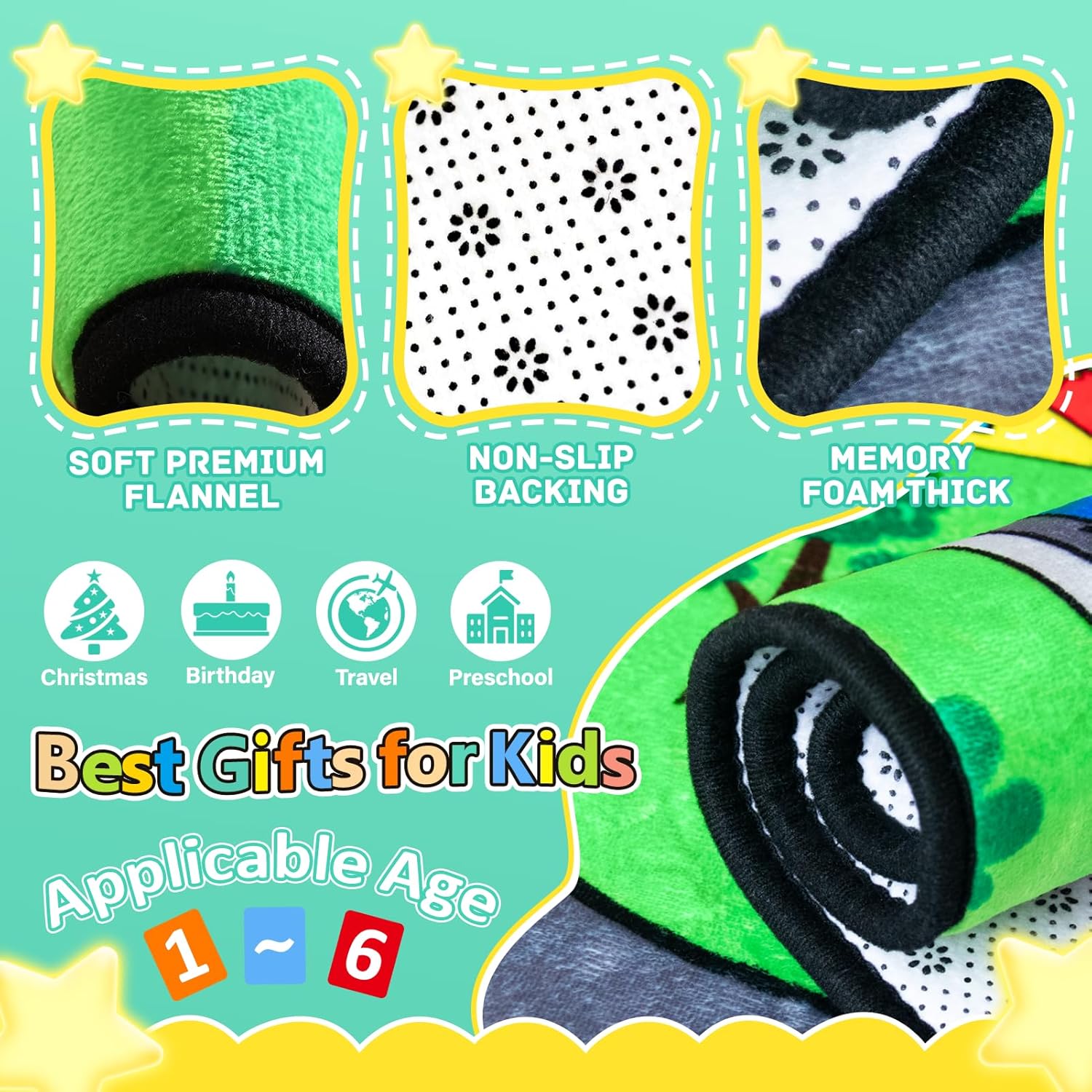 - [Upgraded Material]: Our kids playmat rug is made of premium flannel, and high-resilience sponge, equipped with non-slip backing. The road rug for kids is designed to provide extra cushioning and comfort, protecting babies from bumps and knocks while crawling.