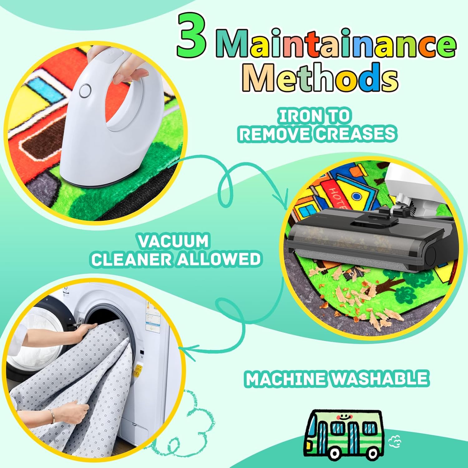 - [Machine Washable Kids Play Rug]: This car rug for kids toy cars measures 4 x 6 feet/48*72 inches. 0.4'' thick. Our mat is easy to clean by vacuum or machine. Perfect bedroom rug, living room rug, and playroom rug.