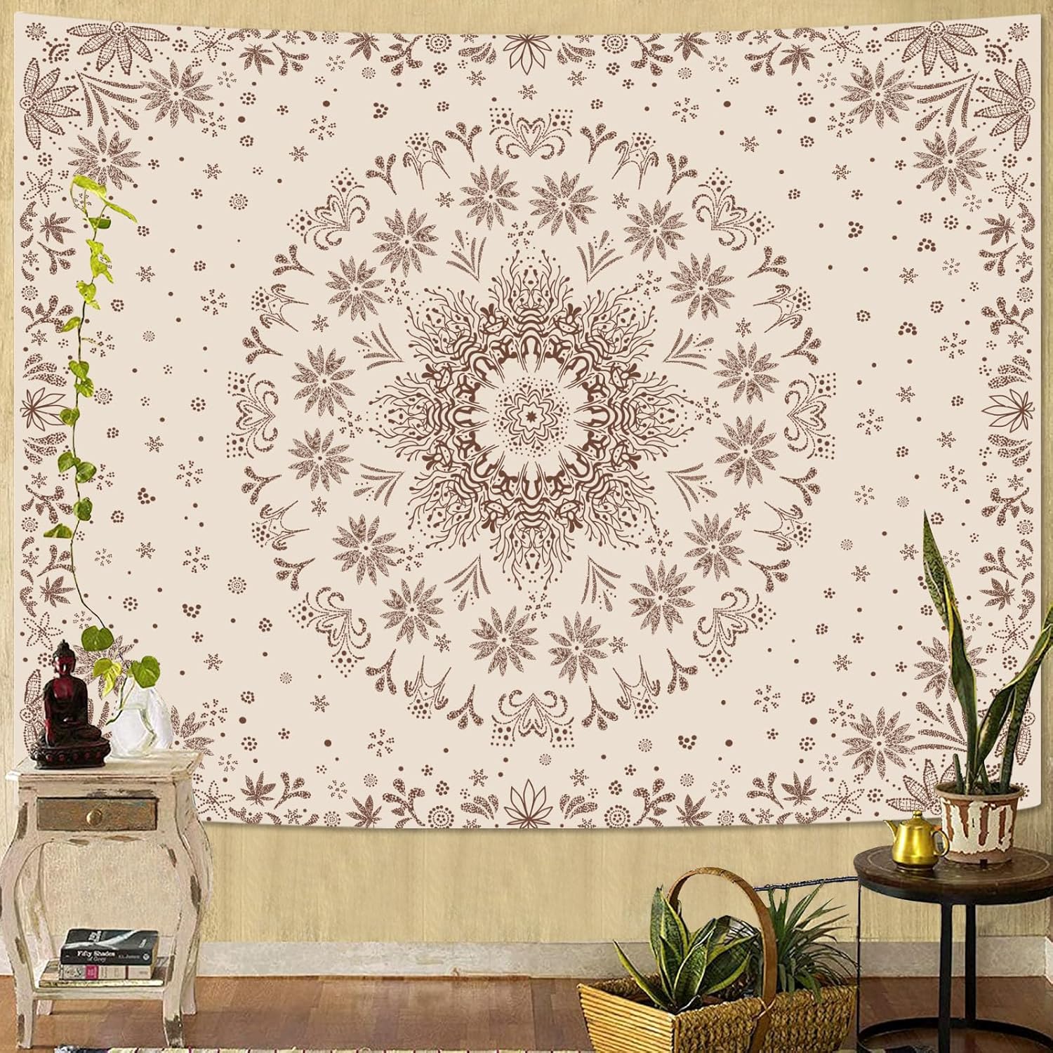 Fowocu Boho Floral Mandala Tapestry Wall Hanging Bohemian Flower Medallion Tapestry Aesthetic Beige Brown Hippie Indian Small Tapestries for Bedroom Living Room Dorm Decor 90 x 68 Inch