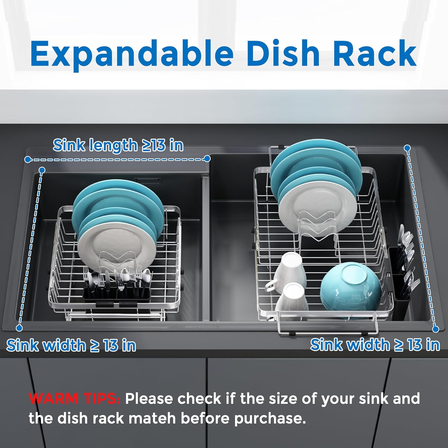 - Versatile Dish Rack:It can be put it in the sink, over the sink or used on the countertop. Make your kitchen looks cleaner and more spacious. Before you purchasing, verify that sink's size fall within the specified range "MORE THAN 13 INCHES" for a better fit