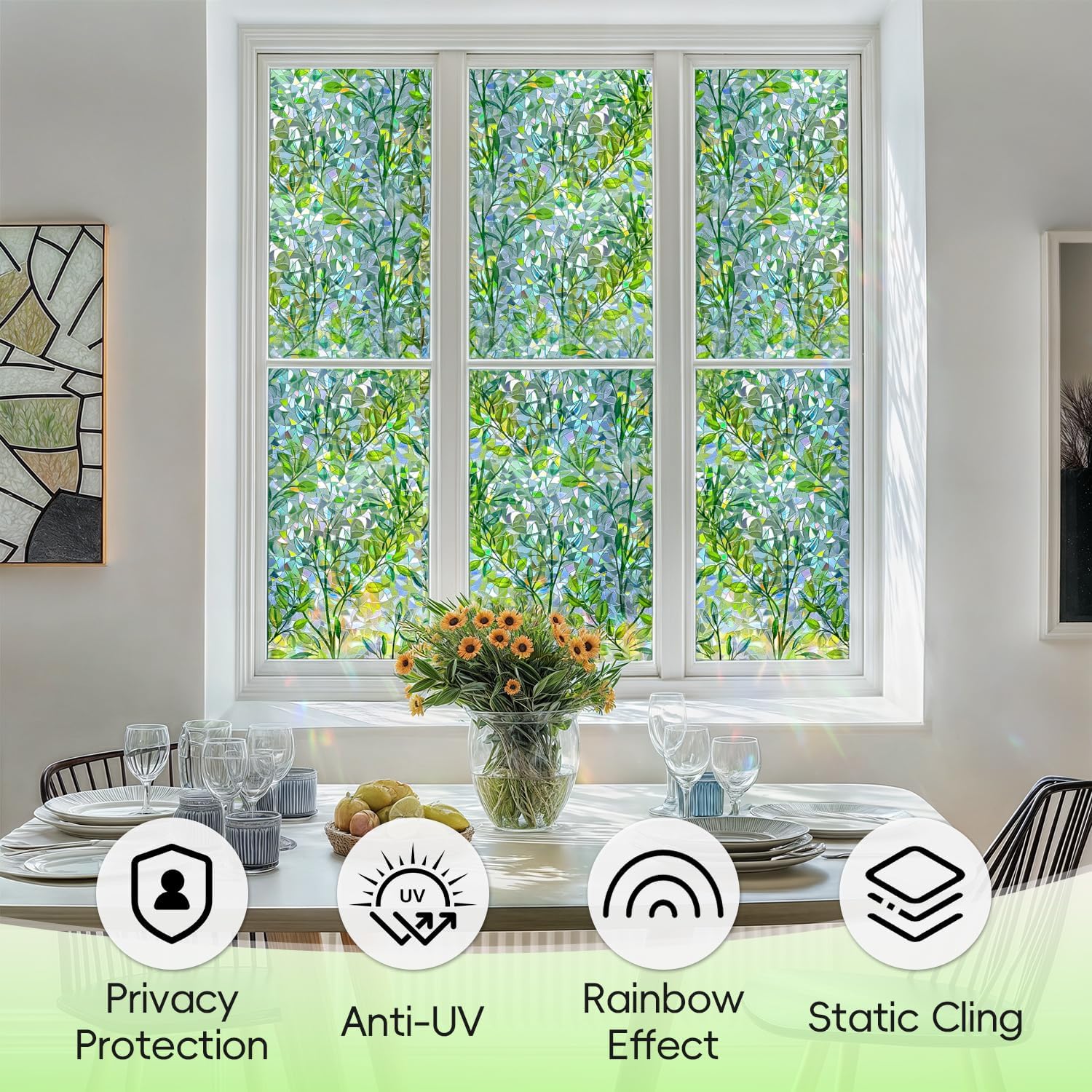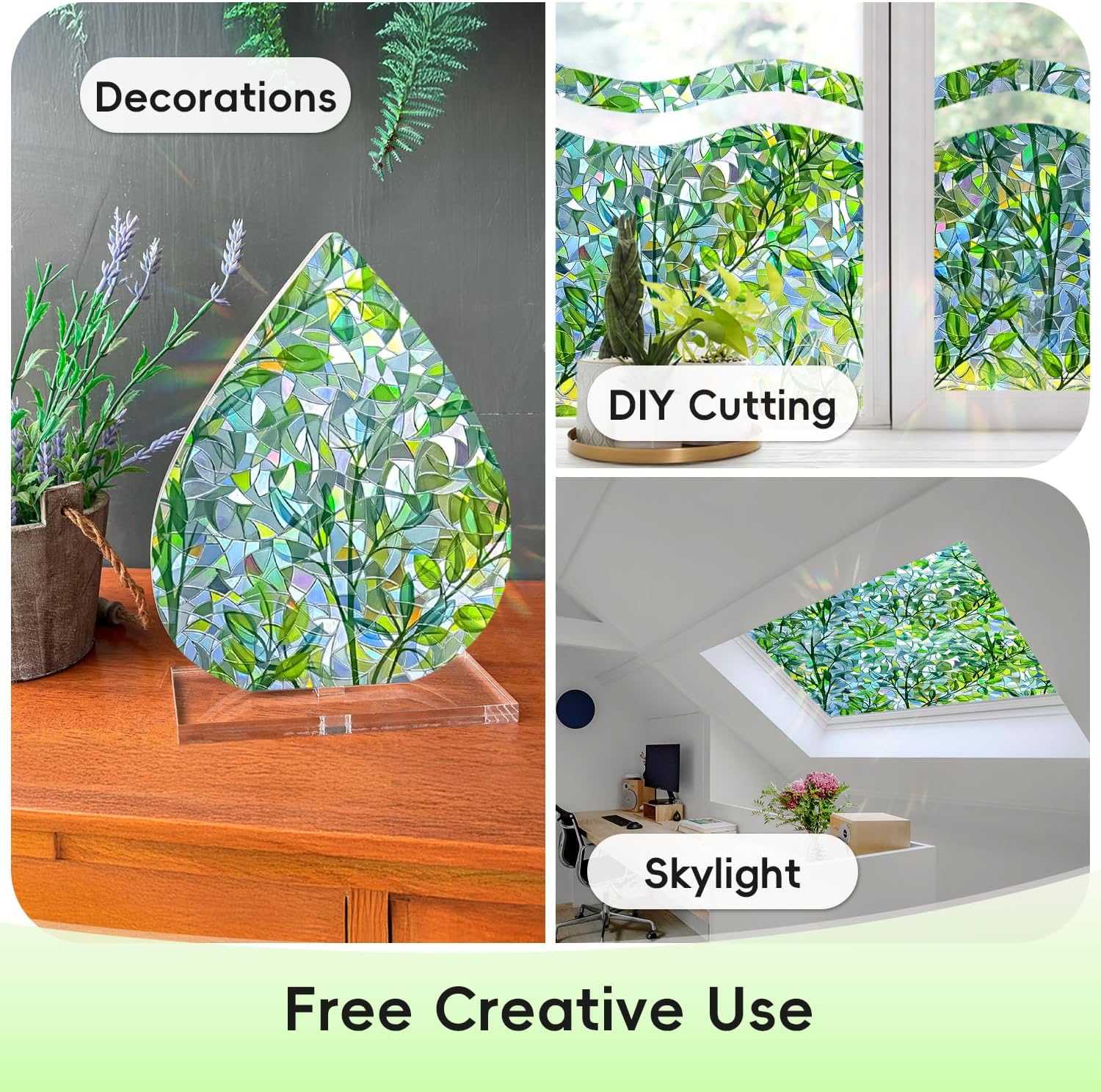 - Charming Visual Effect: When sunlight passes through this colorful stained glass window film, the window displays a mesmerizing rainbow effect, adding a decorative touch to your space. The green leaf pattern radiates a fresh, natural vibe under the light, combining with the rainbow glow to create a stunning visual experience that enhances the beauty and style of your space