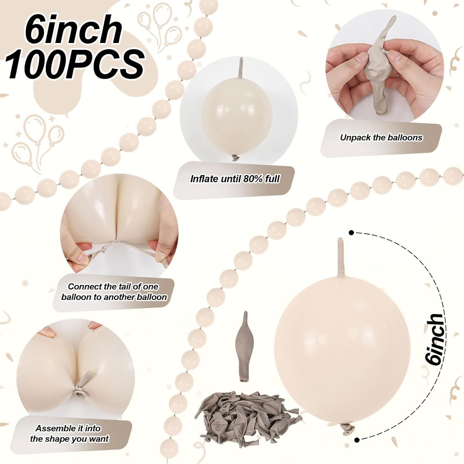 - 💫Diverse assembly - The linking balloons is an excellent choice for balloon chain decoration, balloon wall creation, and various balloon model making. It can be used as a decoration for balloon chains, it can be hung on the ceiling alone to form a hanging balloon chain, can be used for balcony balloon chain decoration, and can be freely matched and connected the beige balloons according to different styling needs.