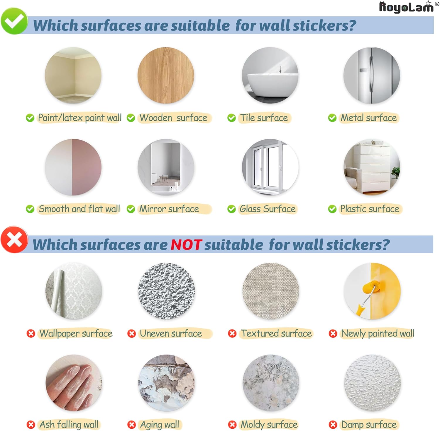 - Application Scenario: Smooth, clean, dry, dust-free and non-textured surface; wall, window, furniture, tiles, mirror, door, cabinet or refrigerator; decorating living room, baby nursery, classroom, bedroom, playroom, bathroom, kitchen, office, etc
