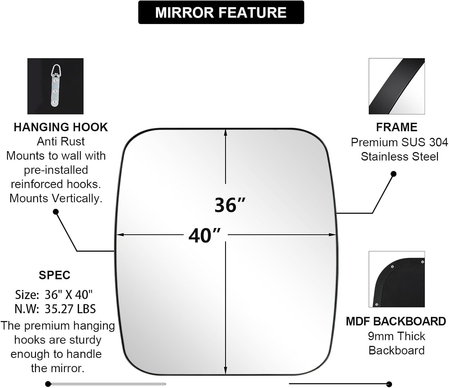 - Transform Spacious Environments: Redesign your spacious bathroom with the large 36x40 inch mirror. Its generous size and premium craftsmanship create a luxurious feel, reflecting light and space to amplify the room's aesthetic appeal and functionality