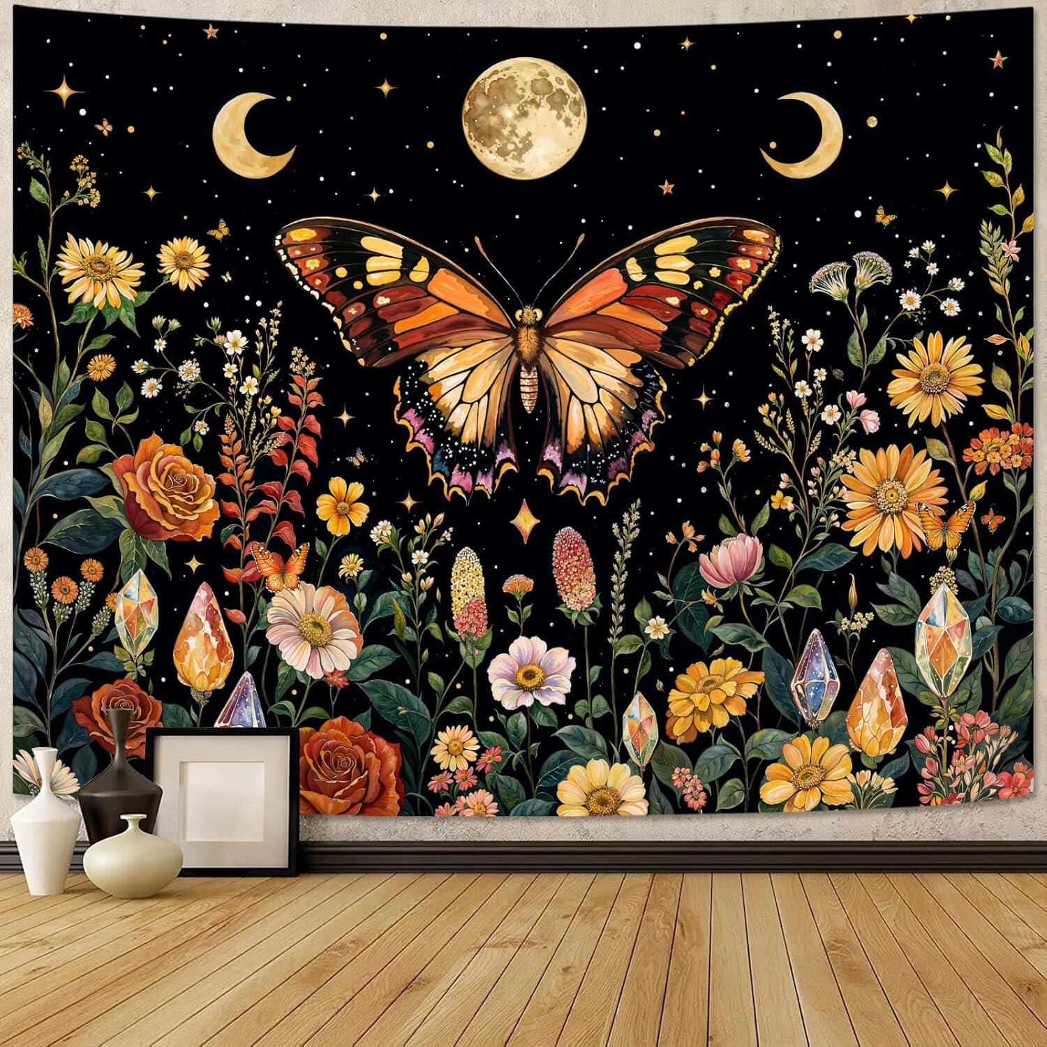 Lunerfex Boho Butterfly Tapestry Flower Moon Wall Tapestry, Moon Phases Tapestries for Bedroom Cute Tapestries Wall Hanging for Bedroom Living Room Decor Butterfly-2 60"x80"
