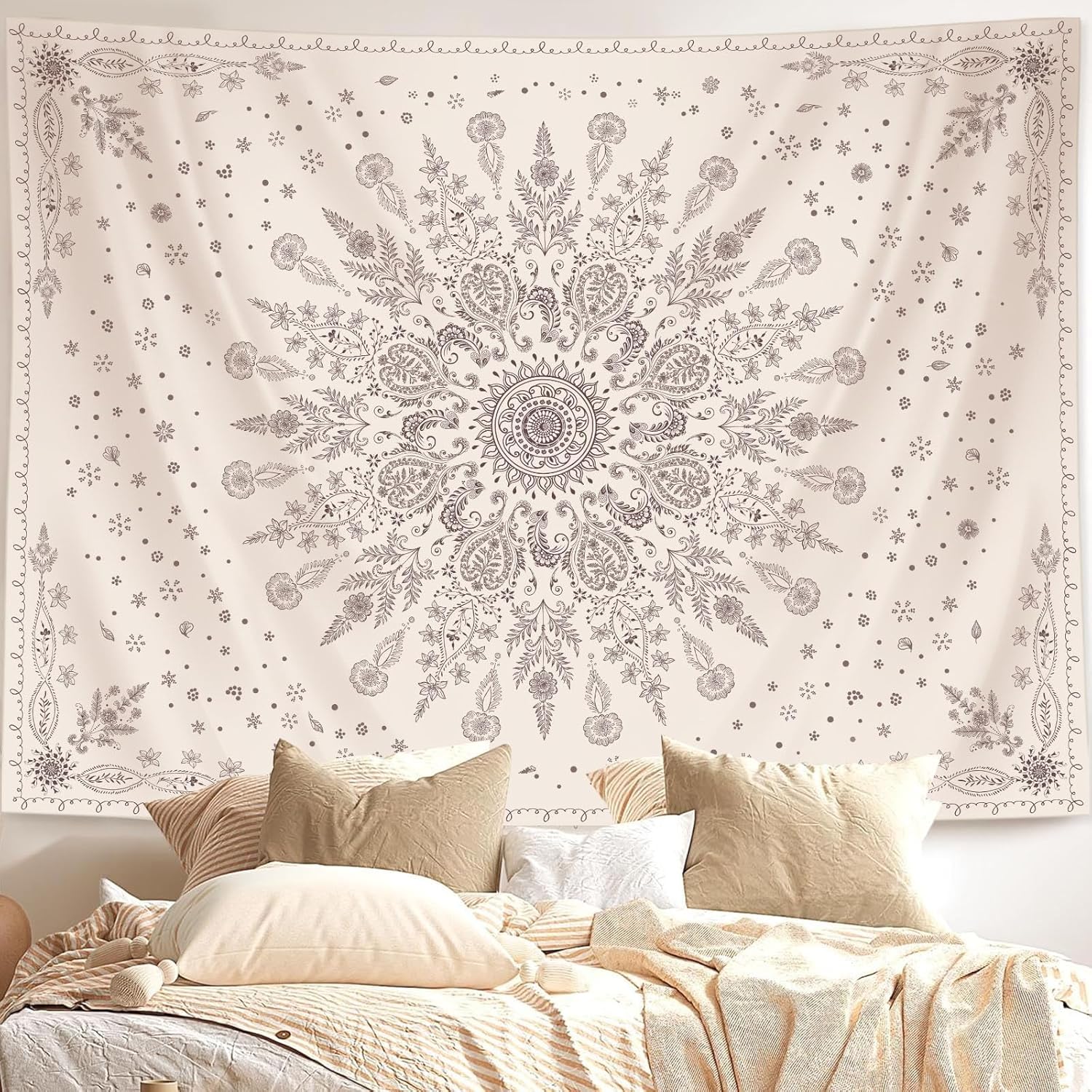 Lunerfex Boho Floral Tapestry Mandala Wall Tapestry, Cute Tapestries for Bedroom Beige Flower Tapestries Wall Hanging for Bedroom Living Room Decor Beige-1 44"x60"