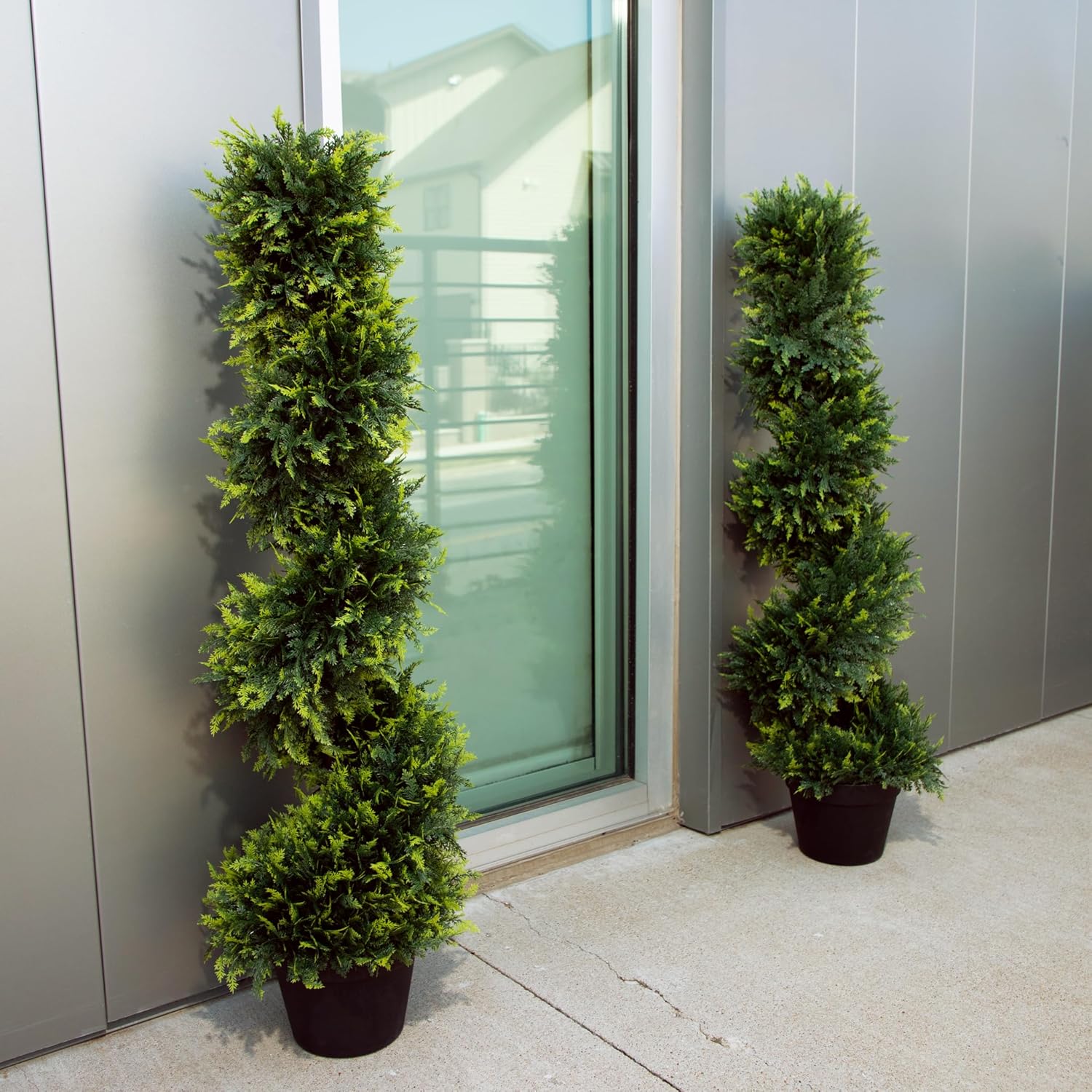 - REALISTIC APPEARANCE - These spiral topiary trees boast a lush, full-bodied look with dense, lifelike foliage that mimics natural boxwood or cedar.