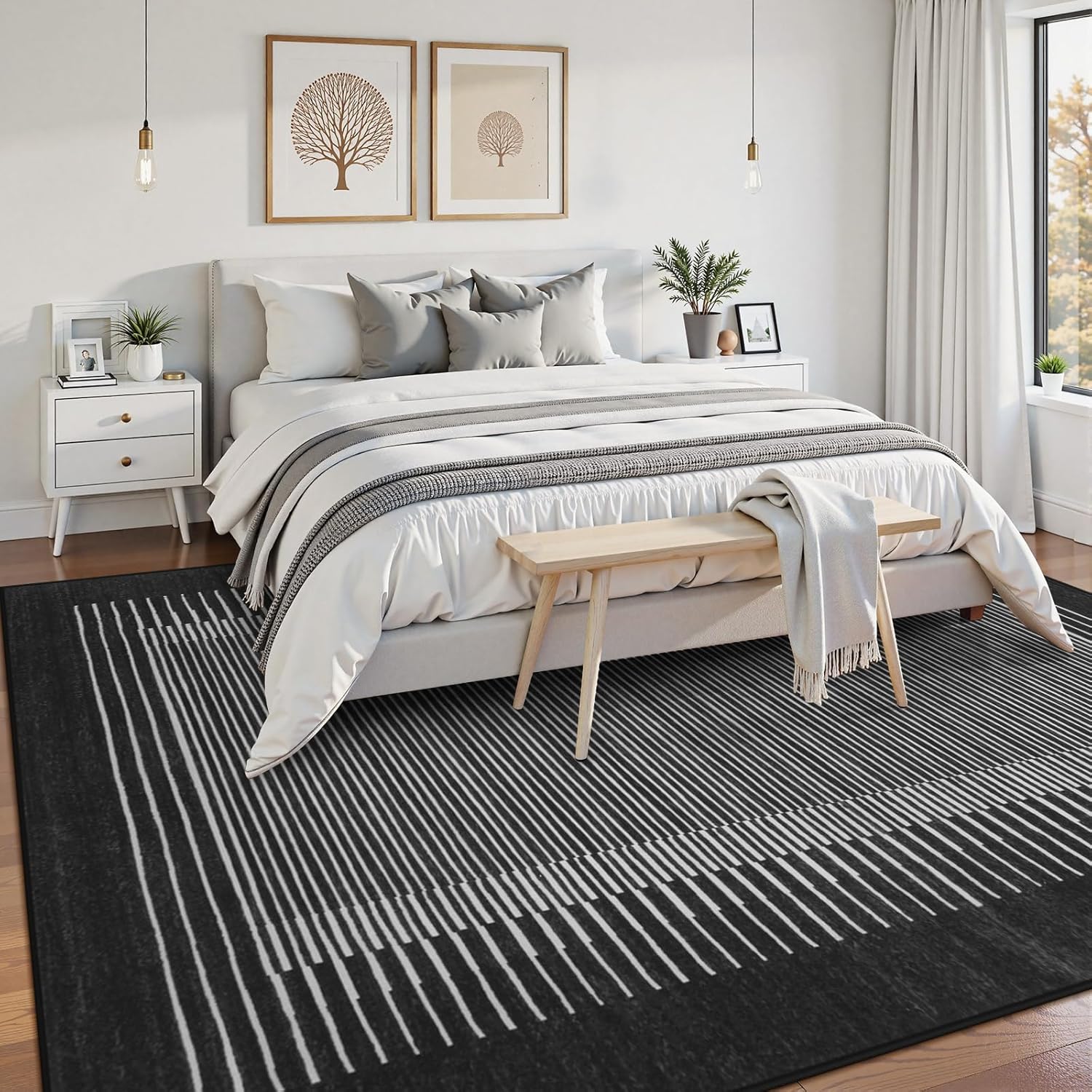Wonnitar Washable Striped 5x7 Washable Area Rug, Non-Slip Black Berber Stripe Rugs for Living Room, Low Pile Minimalist Floor Carpet Rugs for Bedroom Dining Room Home Office (Black,5' x 7')