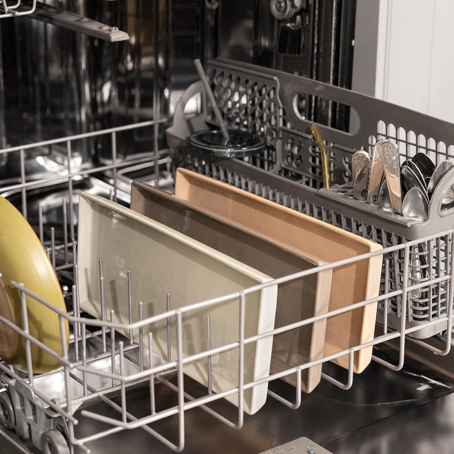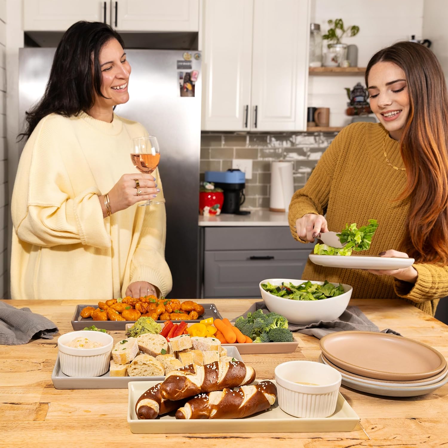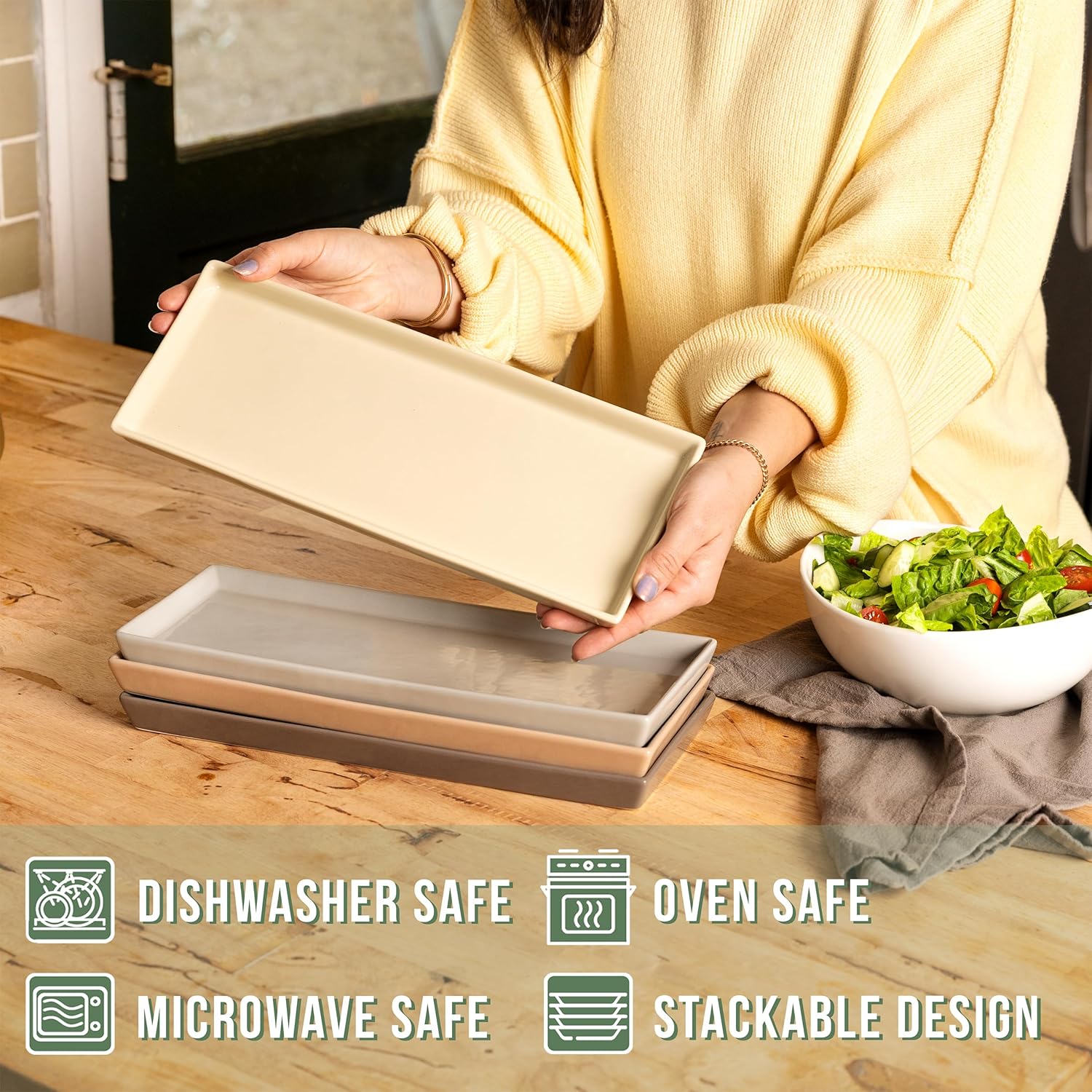 - Set of 4 Ceramic Trays โ Uniquely and beautifully designed rectangular ceramic serving trays that are great for any occasion; Beautiful neutral colors will match any of your homeโs decor; Each dish is 14โ x 6โ