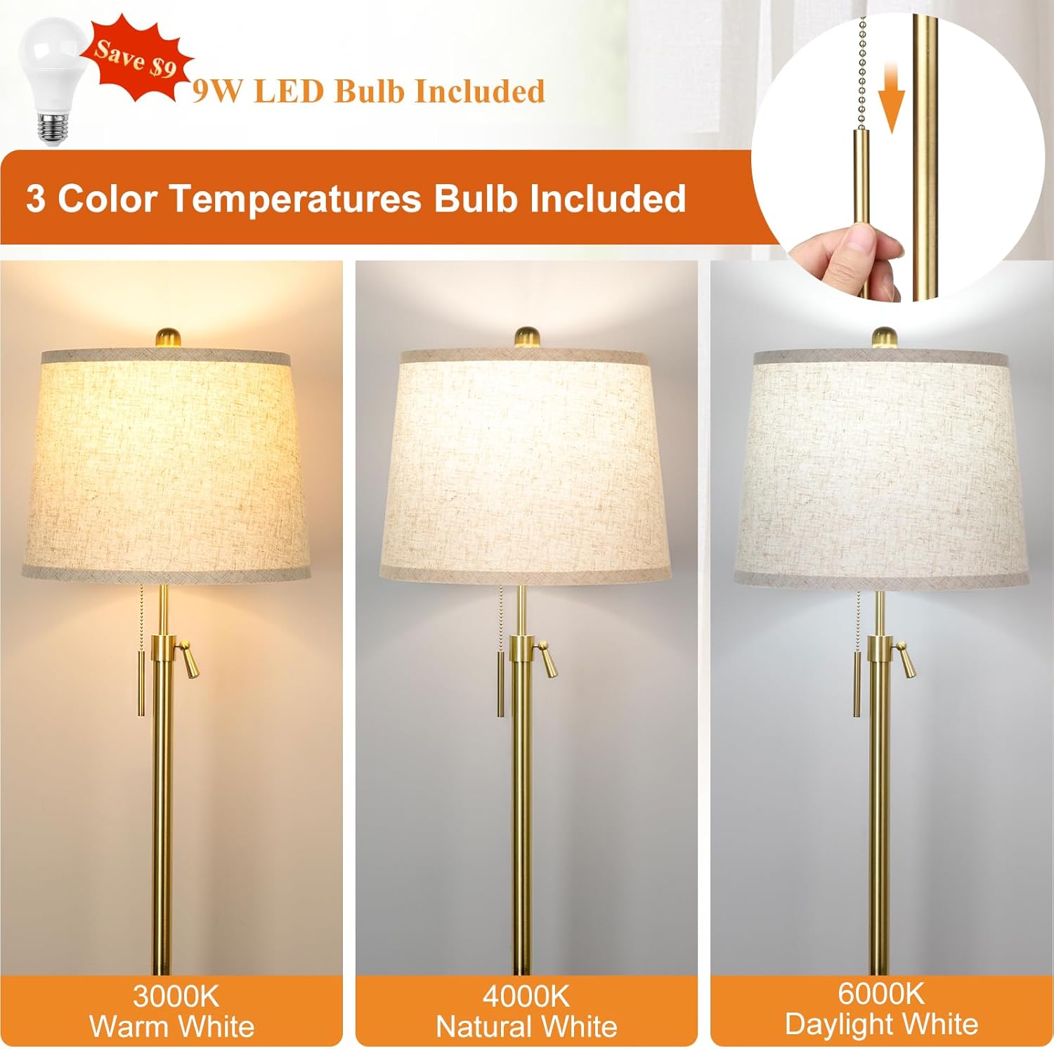- 3 Color Temperature LED Bulb: Our Dimmable Floor Lamp includes a 9W LED bulb with 3 color temperatures -3000K/4000K/6000K (warm white/natural white/daylight) to meet different scene uses. Warm white light creates comfortable mood lighting before bed, and daylight is bright enough for reading. You can easily change the color temperature of the LED floor lamp to set the overall mood associated with your home decor or lighting