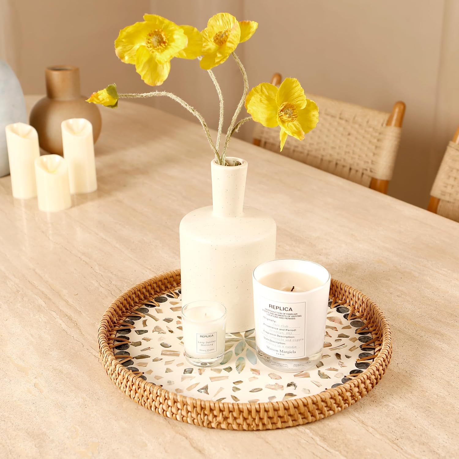 - Handwoven with Care: Each tray is carefully woven by skilled artisans, natural rattan texture and the subtle shine of seashells, reflecting a high level of craftsmanship and attention to detail