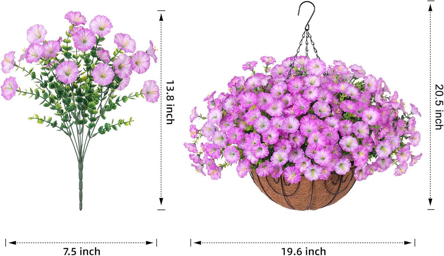 - π’ Artificial Hanging Morning Glory Flowers Basket: Package include 12 bundles Realistic silk morning glory match with green eucalyptus leaves, 1 Hanging Basket with chain, 1 foam, 1 green hat. Enjoy vibrant blooms year-round, regardless of the season or weather conditions.