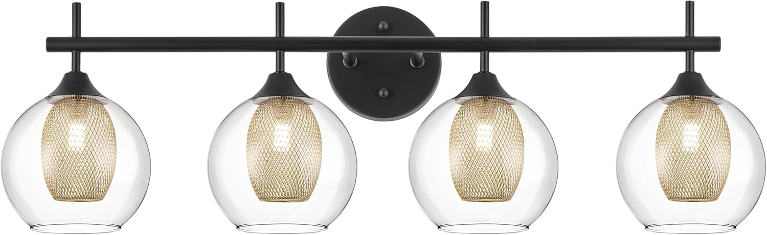 Bathroom Light Fixtures, 4-Light Black and Gold Vanity Lights Over Mirror, 30inch Farmhouse Wall Sconce Lighting with Clear Glass and Honeycomb Metal Shade, AD-22001-4W-BK