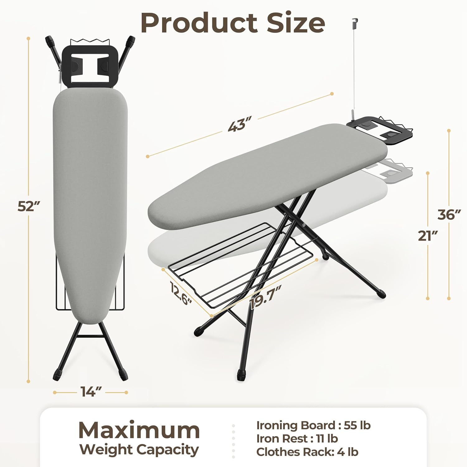 - Full-size Ironing Board: The iron stand provides ample space to meet all your ironing needs. The 43″ L× 14″ W surface ensures an efficient ironing and sewing experience and is ideal for larger garments
