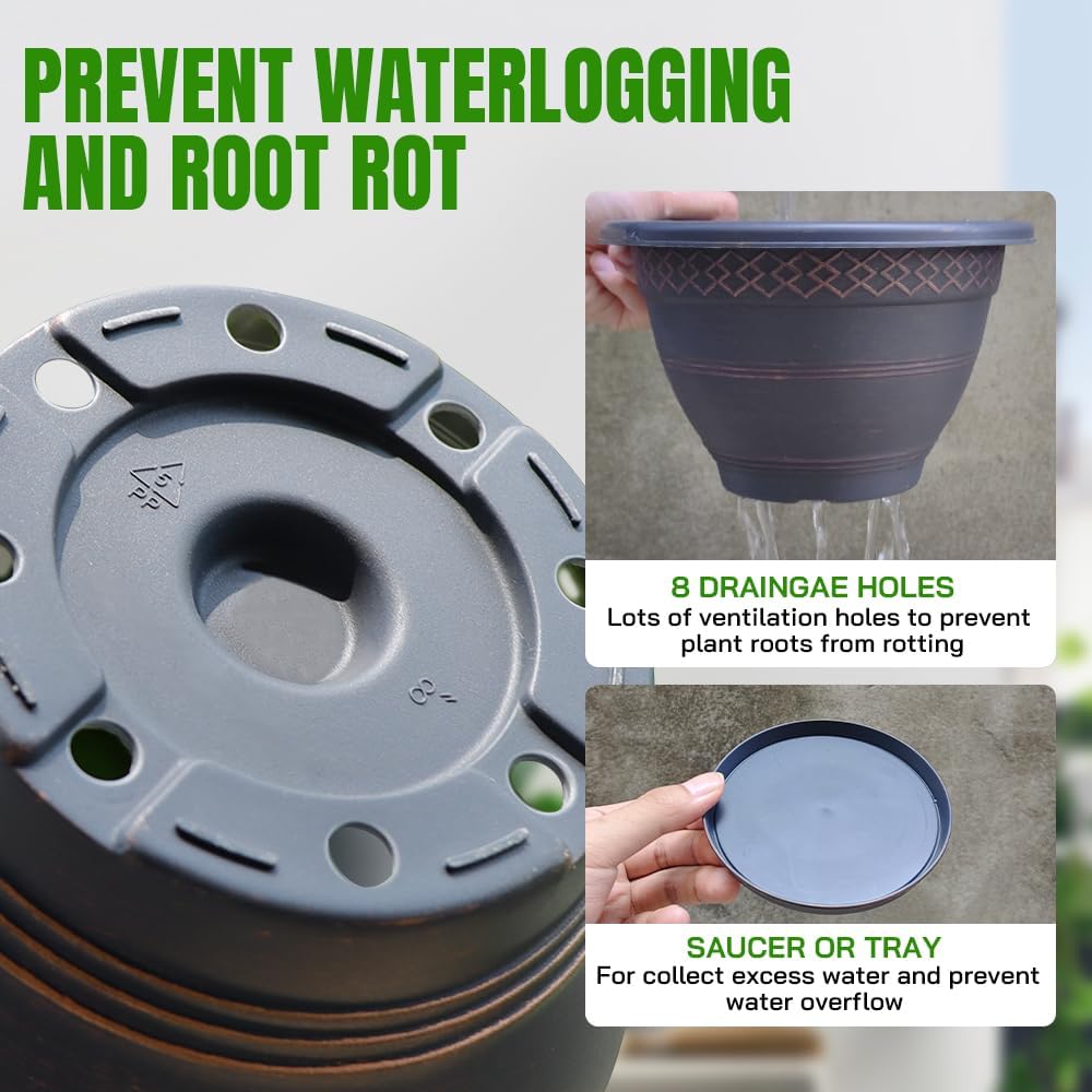 - Drainage Hole and Saucer - There are 8 drainage holes at the bottom of our garden pots, which can control excess water, increase the breath ability and benefit the growth of plants; the lightweight saucer can not only collect excess water,but also keep your floor or desktop clean.