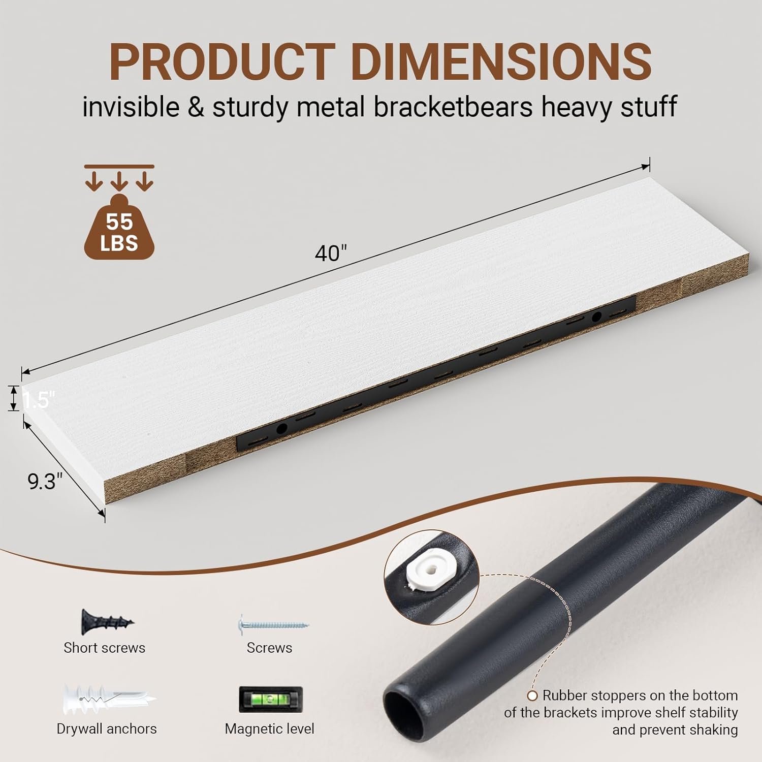 - ăSturdy & Reliable MaterialăThe Floating shelf for wall use metal brackets and screws to be firmly fixed to the wall without sagging.Our 40 inch floating shelf are made of high quality MDF material,can hold up to 55 lbs to safely place your items.