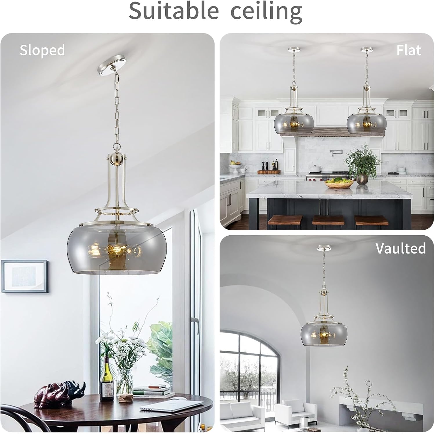 WUZUPS Nickel Chandelier Rustic Farmhouse Industrial Round Ceiling Pendant LED Light Fixture Electroplated Gray Glass Shade for Dining Room Kitchen Island Foyer Entryway, H 20.9" W 15.9", E26 Base