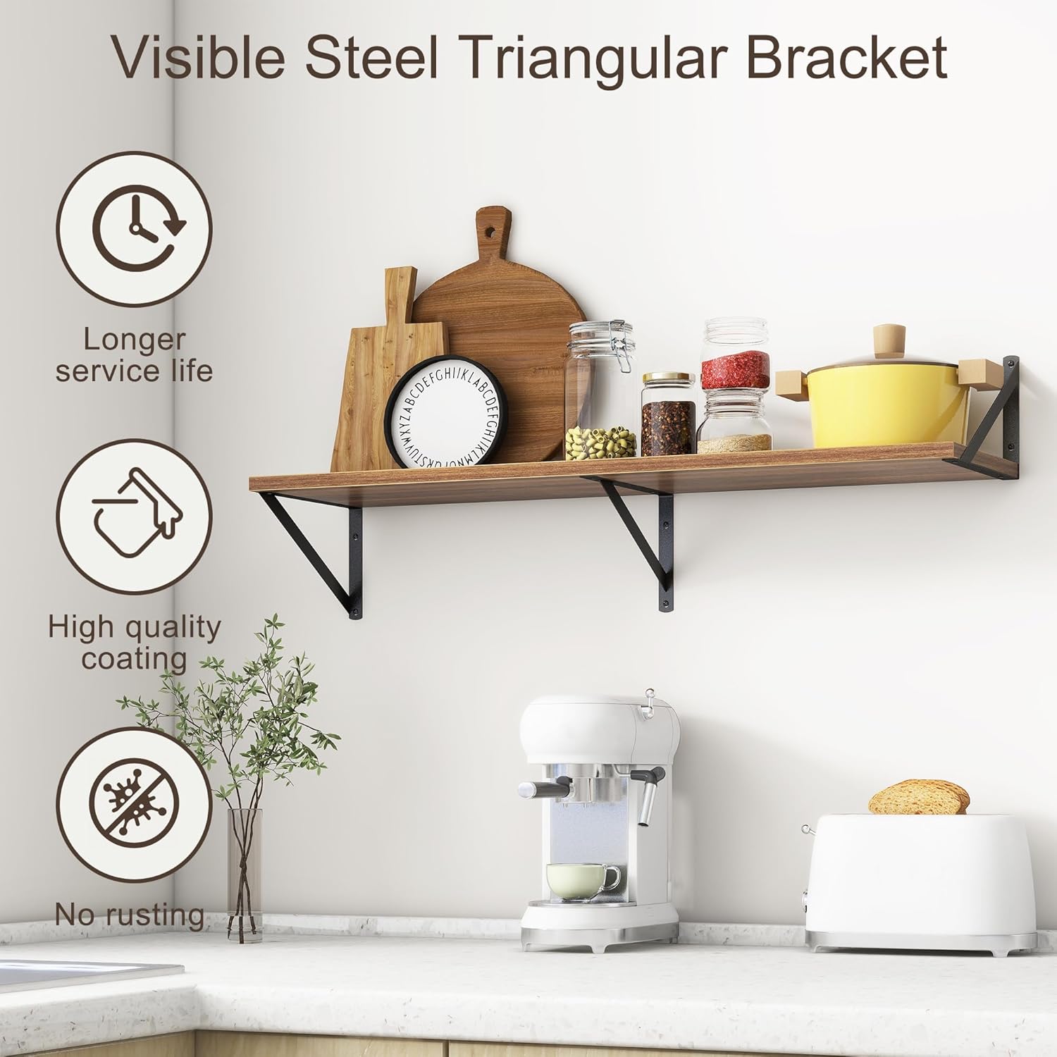 - ăFARMHOUSE RUSTIC WALL SHELFăThese floating shelves are made of premium engineered wood board and visible triangular bracket. The rustic wooden grain surface add character and warmth to any modern or traditional interior with these deep floating shelves, contrast shelves at staggering heights on the wall or mount side-by-side or in the corner for a clean streamlined look.