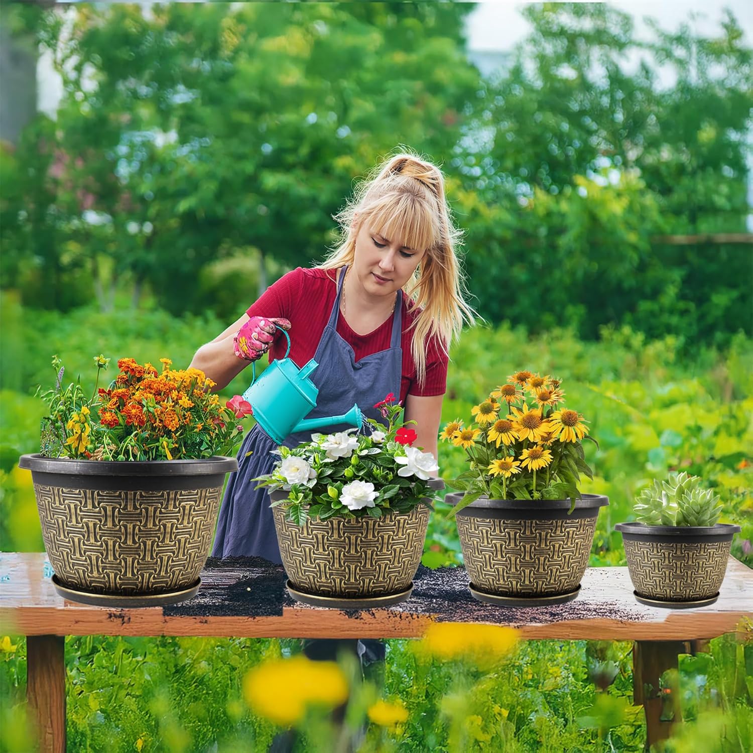 - 【WEATHER RESISTANT】Our Planters pots for plants are made of sturdy recyclable plastic. Allow you to enjoy these flower pots outdoor in all types of weather. Built to withstand intense sun and harsh winter temperatures, free from fade, frost, crack and peel damage so you can use it indoors and outdoors freely.