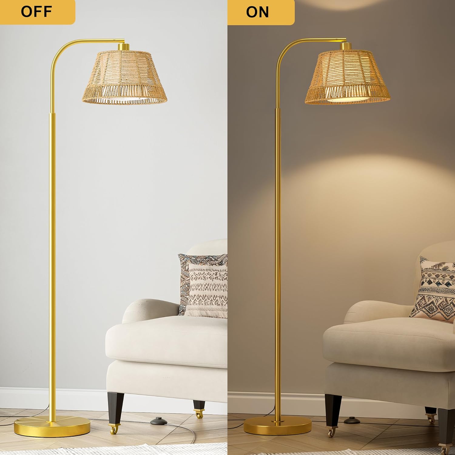 - Handcrafted Rattan Shade for Natural Elegance:This boho floor lamp features a beautifully handwoven rattan shade, adding a touch of natural warmth and texture to your home decor. The gold metal pole and base provide a sleek, modern contrast, making it a perfect blend of rustic charm and contemporary style. Ideal for living rooms, bedrooms, or offices, this lamp enhances any space with its timeless design.